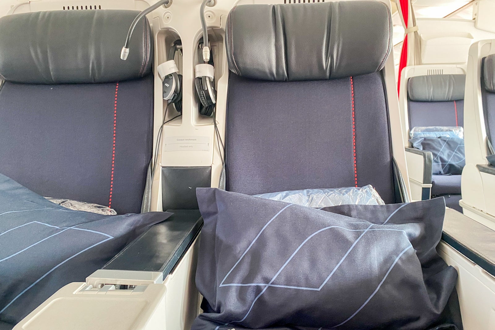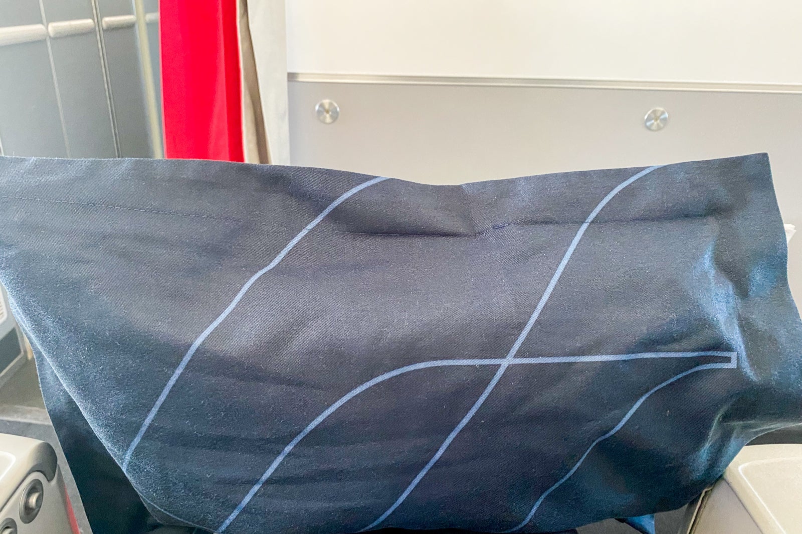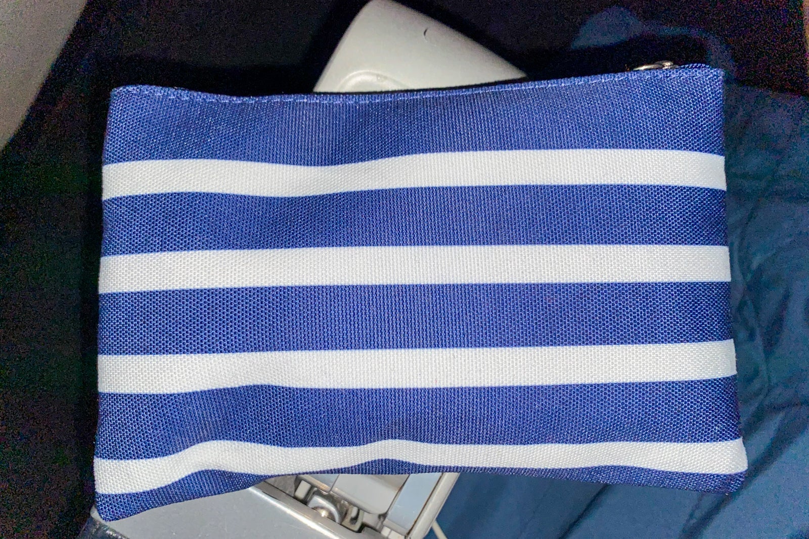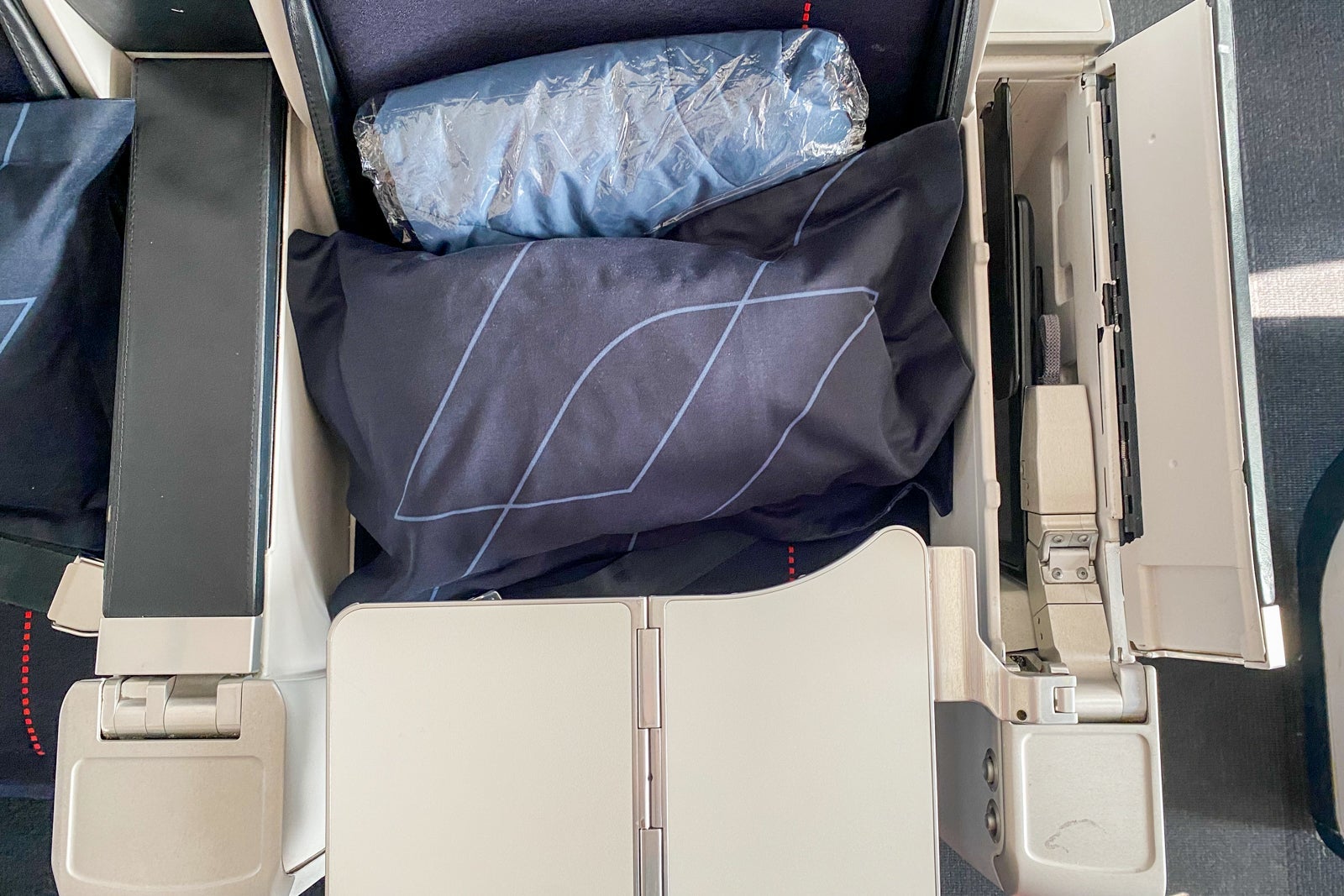 Awaiting me on my seat were a pillow and blanket (larger and more durable than those in economy). An amenity kit and moist towelette came shortly after. There were also basic noise-canceling over-ear headphones hanging between each seat.