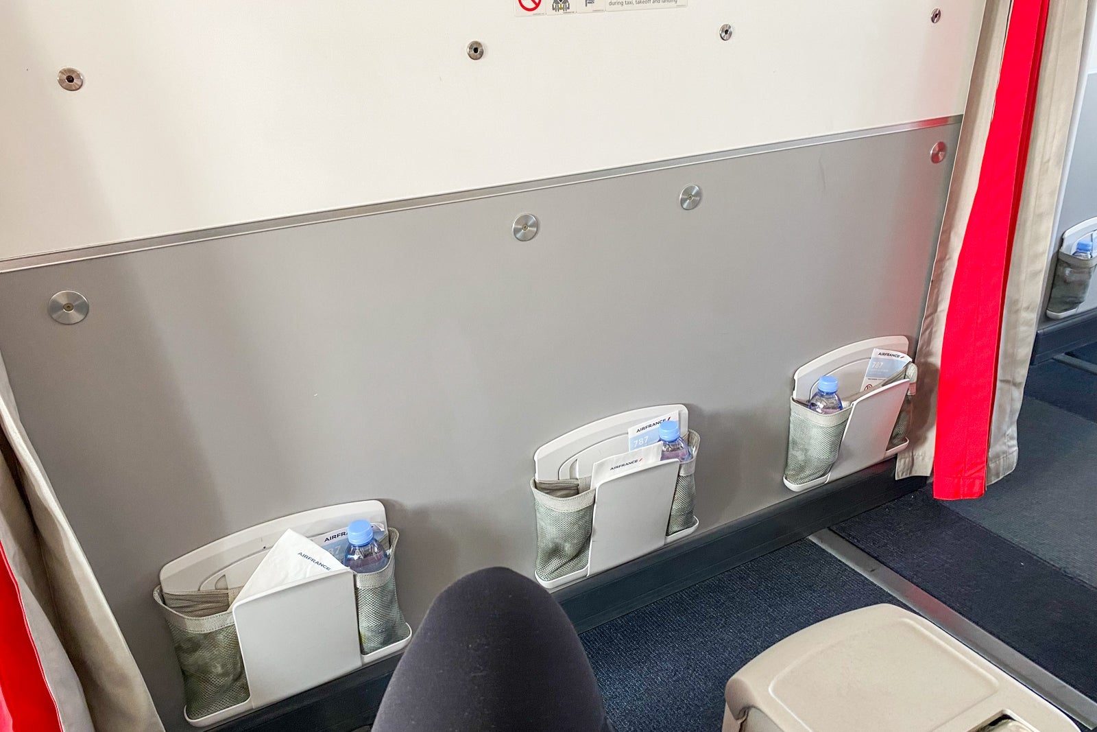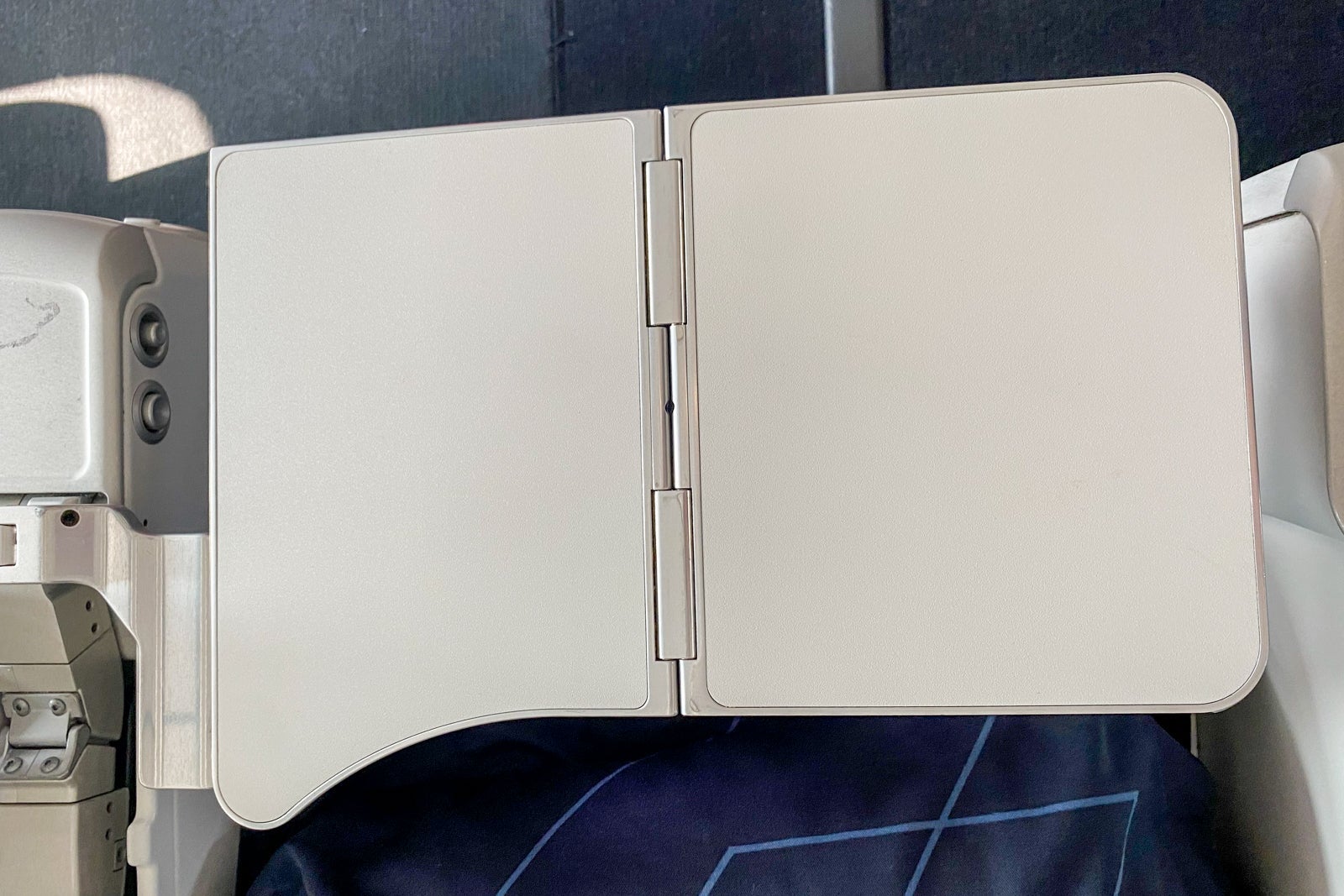 A bi-fold tray table slid from the aisle armrest to lie flat on the center console. Though it lacked a dedicated cupholder, it worked fine for meals served on a tray and was large enough to accommodate my laptop. The tables in the non-bulkhead seats also slid out of the armrests. A small storage area was on the wall in front of the bulkhead seats, holding a water bottle.