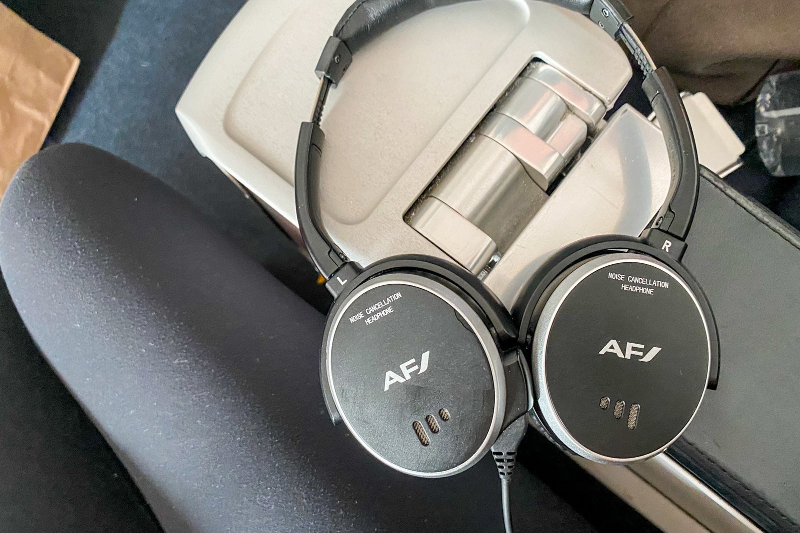 Though compatible with the provided headphones, you could also link wireless headphones to the system via Bluetooth. The headphones were noise-canceling in the sense that they blocked out background noise to a degree but not fully. So, you might want to use your own wireless headphones rather than the airline-provided ones.