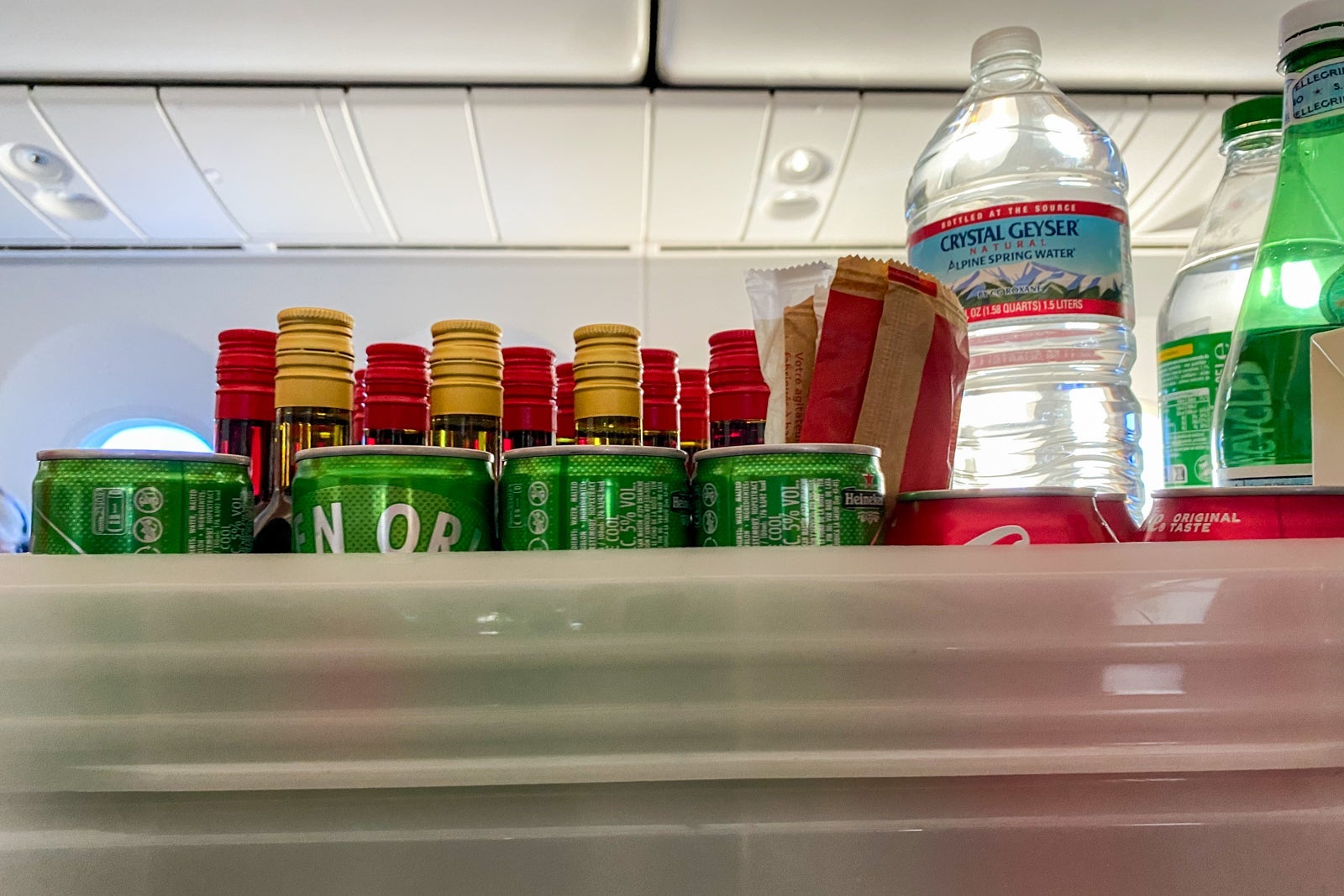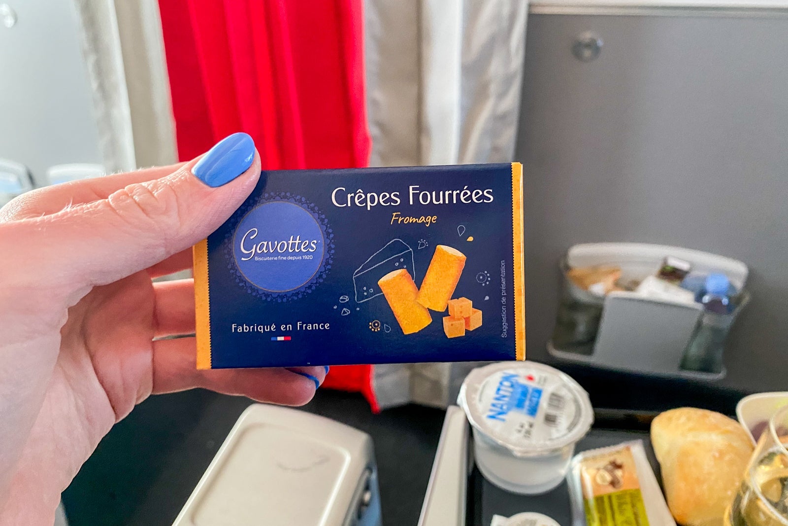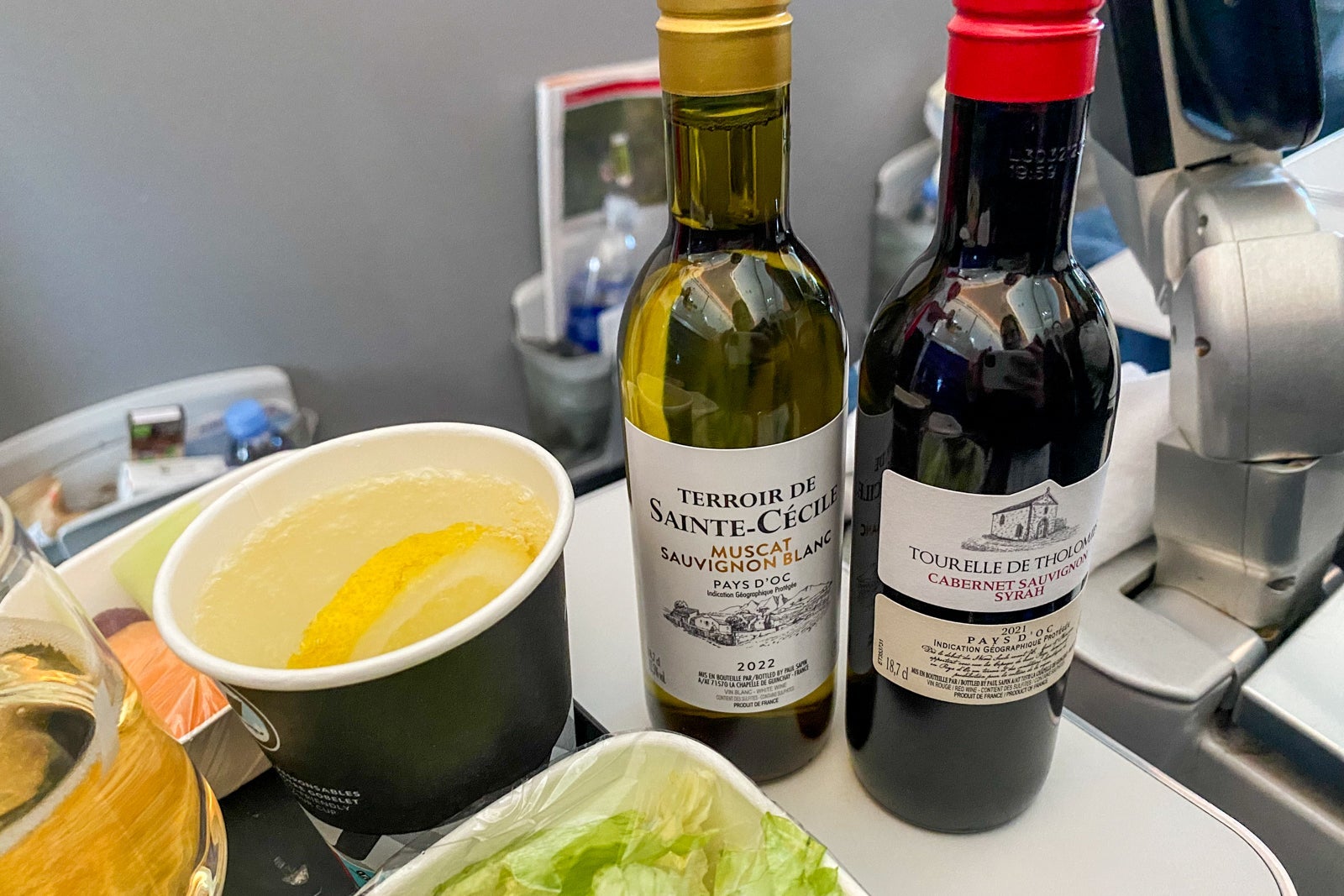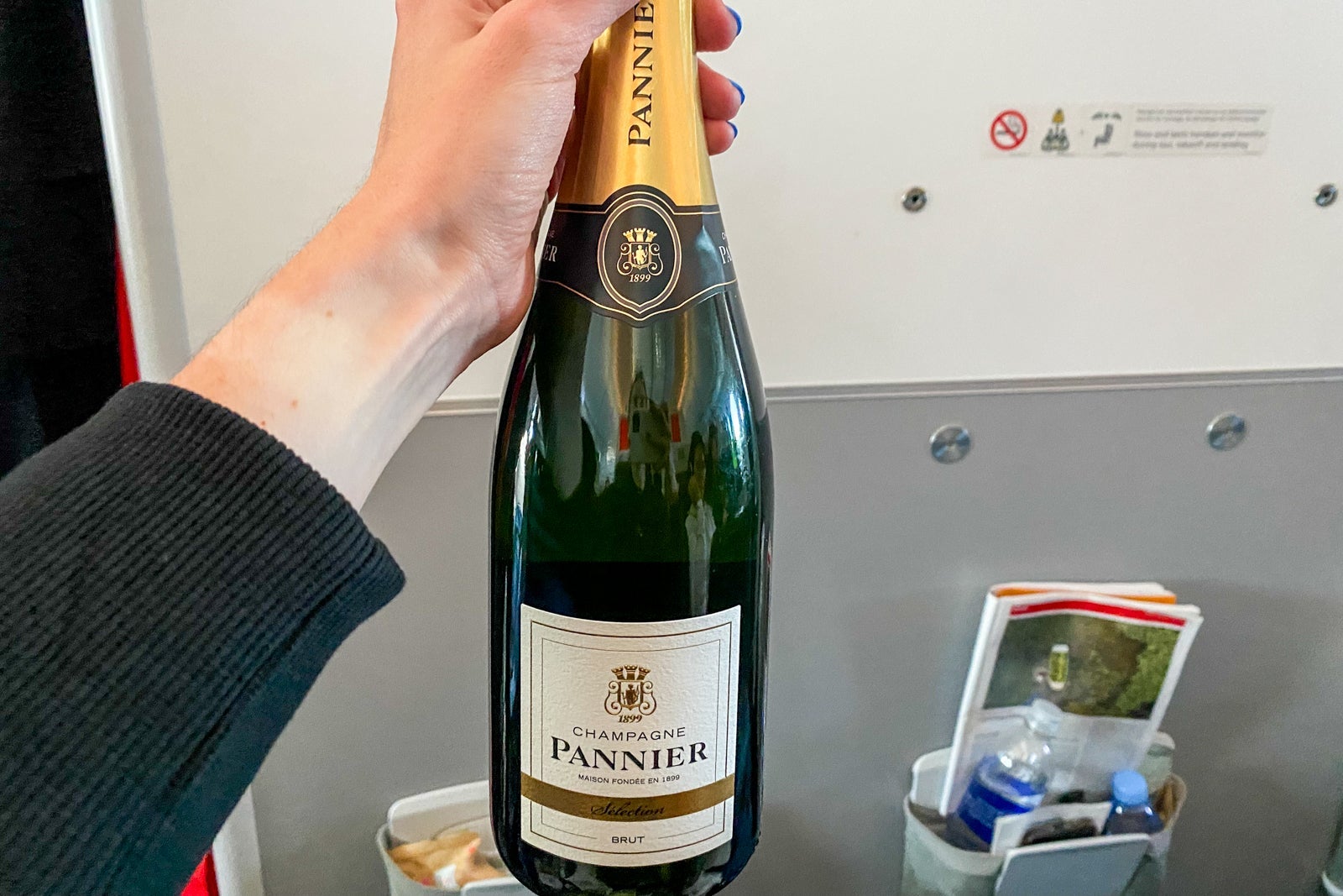 Various complimentary beverages were available, including still and sparkling water, red or white wine, Champagne, tomato juice, Sprite and Coke. In true French fashion, all passengers, regardless of cabin, could enjoy free Champagne. Business-class passengers received Champagne from $50-$60 bottles like Taittinger Brut Reserve. Premium economy and economy classes received less expensive Champagne, such as the Pannier I was served, which goes for $19.