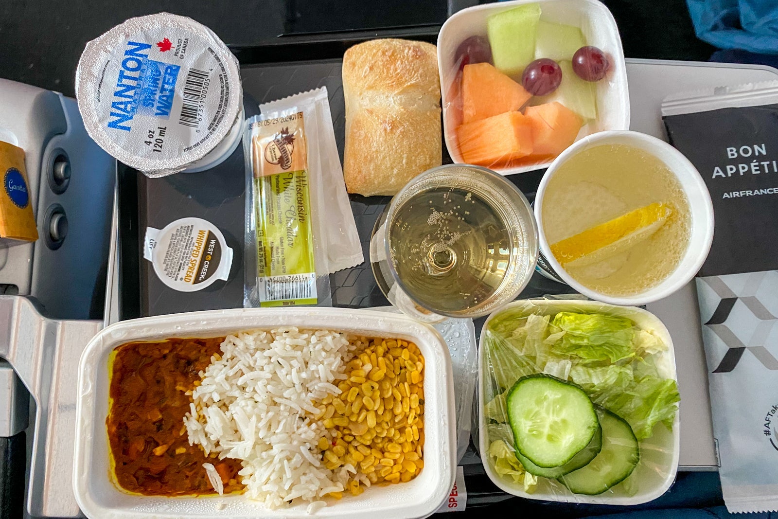 Even though I was seated in premium economy, they still served me the vegan economy meal that I had preordered: masala vegetarian rice, fruit, cheese and a side salad. The premium economy meals served around me were veal or chili, which looked exactly like my dish. Though I appreciated the attention to my dietary restrictions, the meal lacked taste overall, excluding the cucumbers in the salad.
