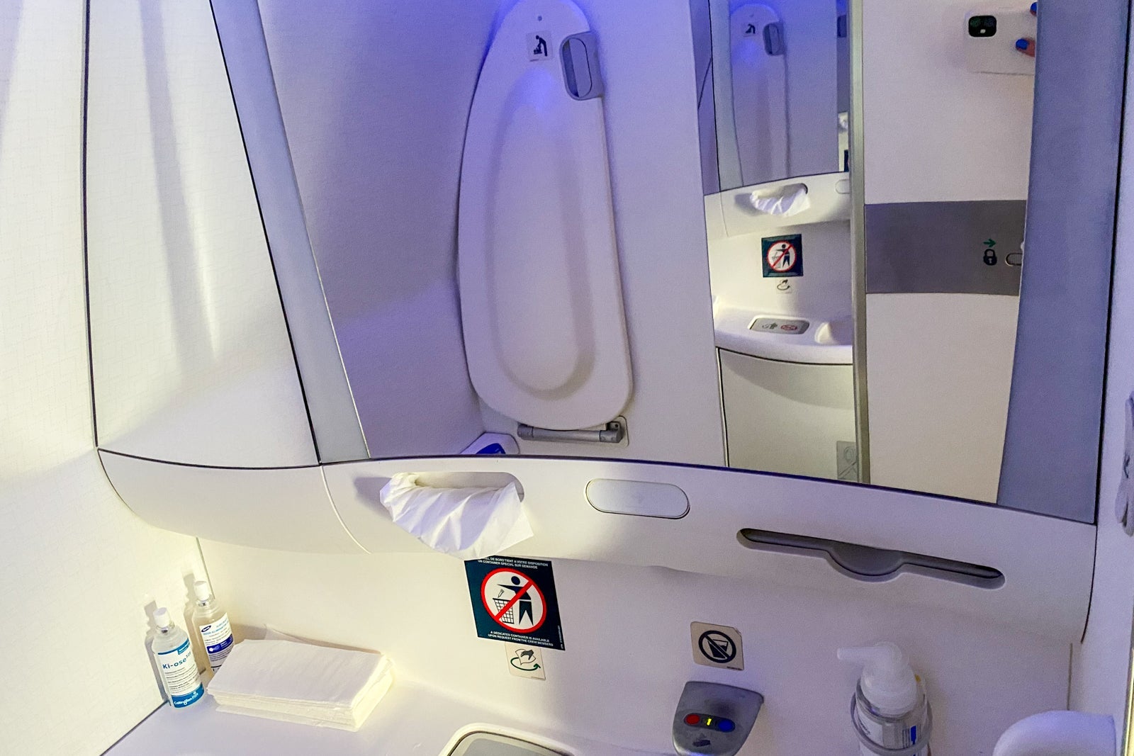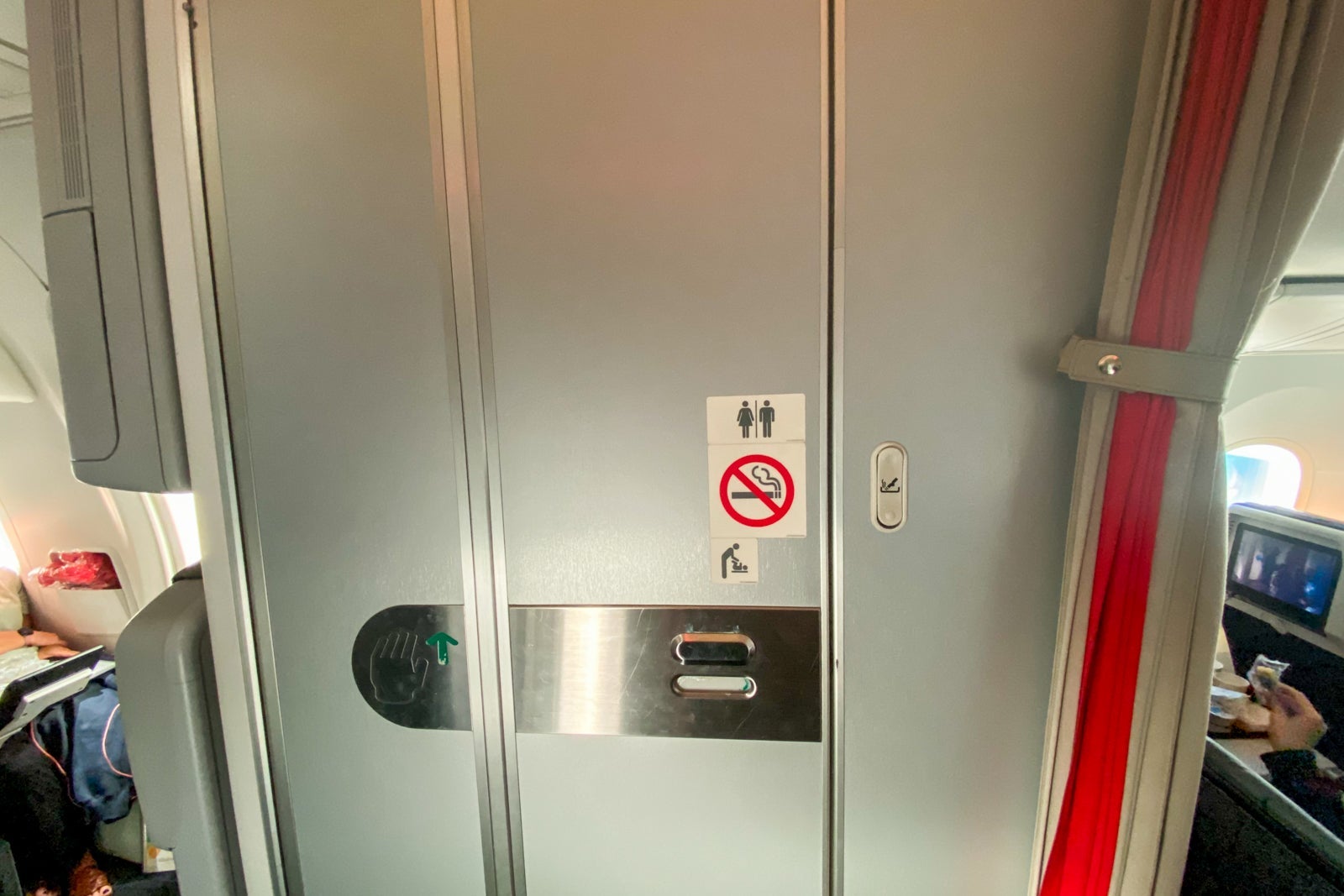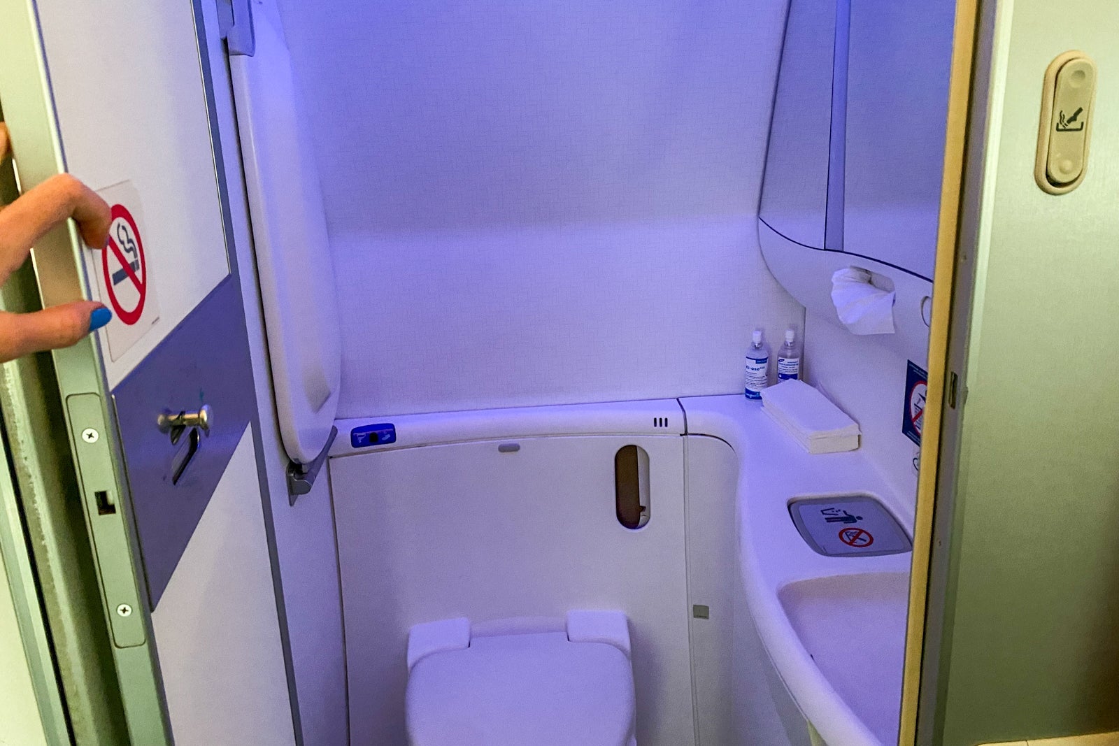 The premium economy cabin shared four lavatories behind it with the regular economy cabin, and I did not experience a wait at any point. Flight attendants kept the bathrooms clean during the flight.
