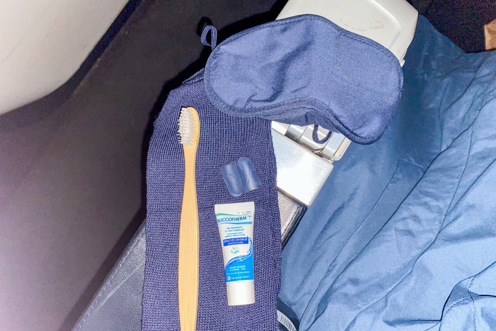 The small amenity kits contained a toothbrush, toothpaste, eyemask, socks and earplugs.