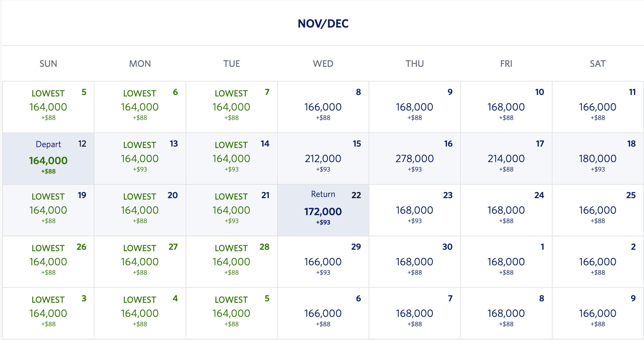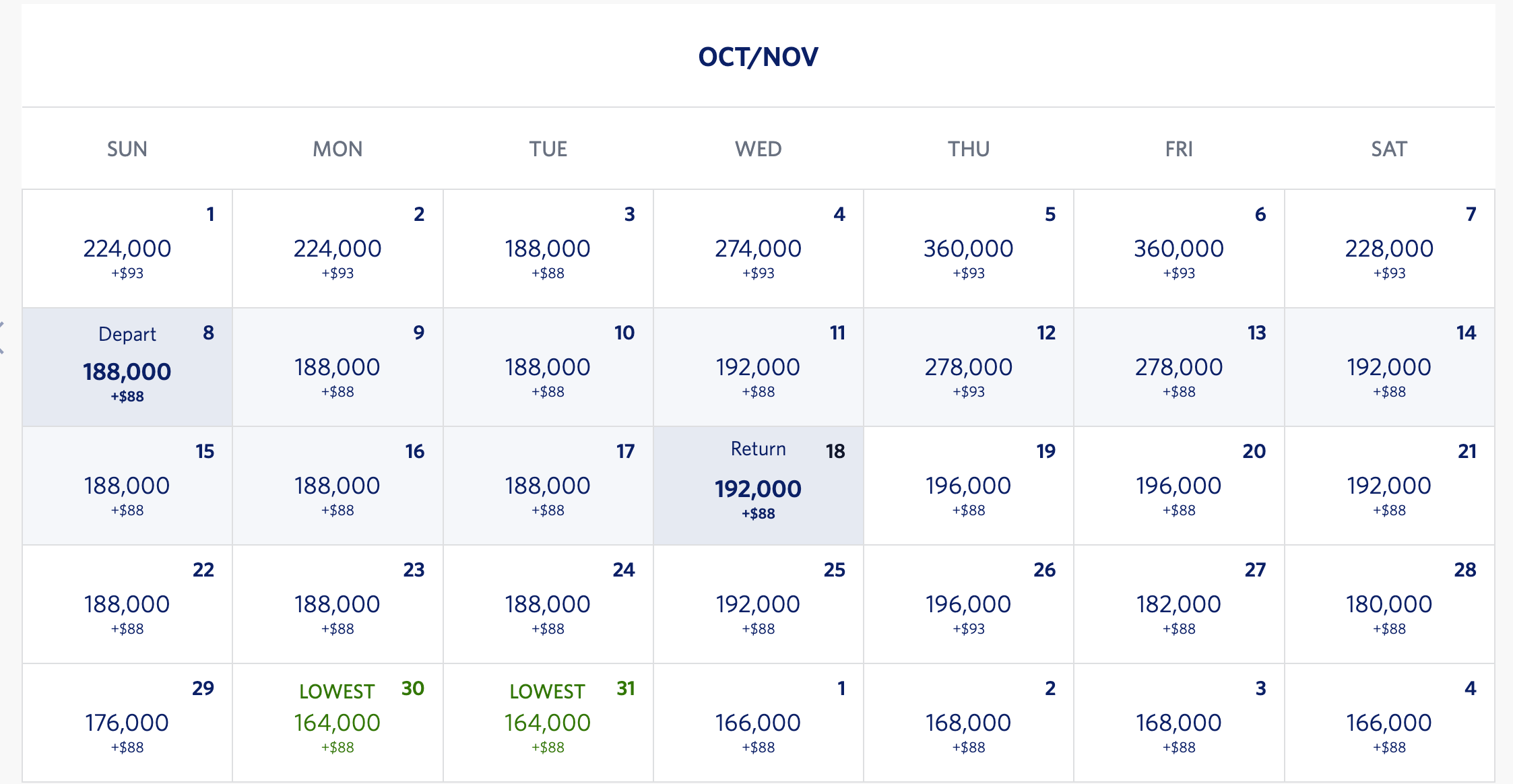 Flying Blue miles + taxes/fees | 22,500-111,500 miles plus $204-$216.54 | 45,000-299,500 miles plus $270 | 175,000-567,000 miles plus $346-$348 |