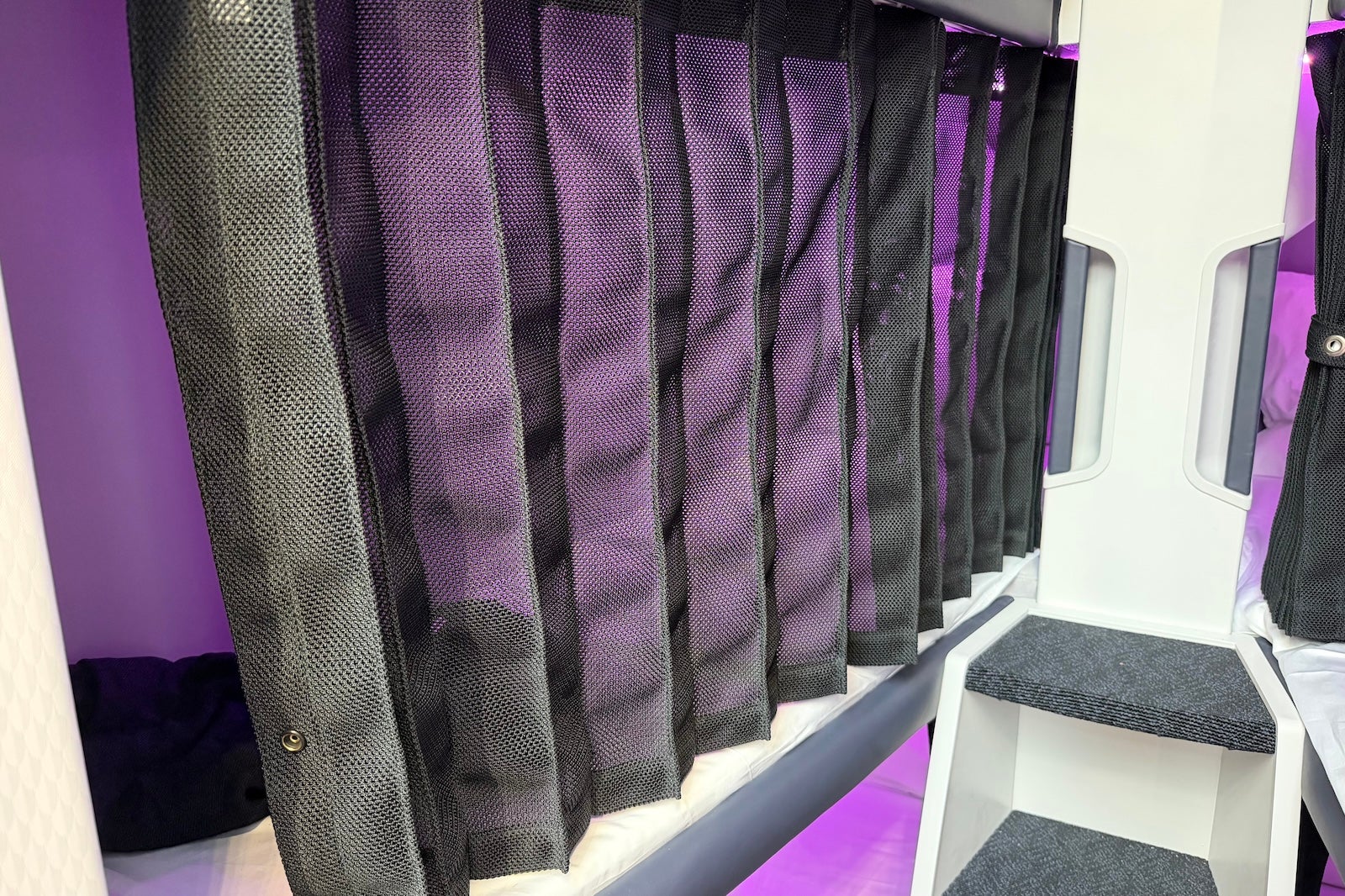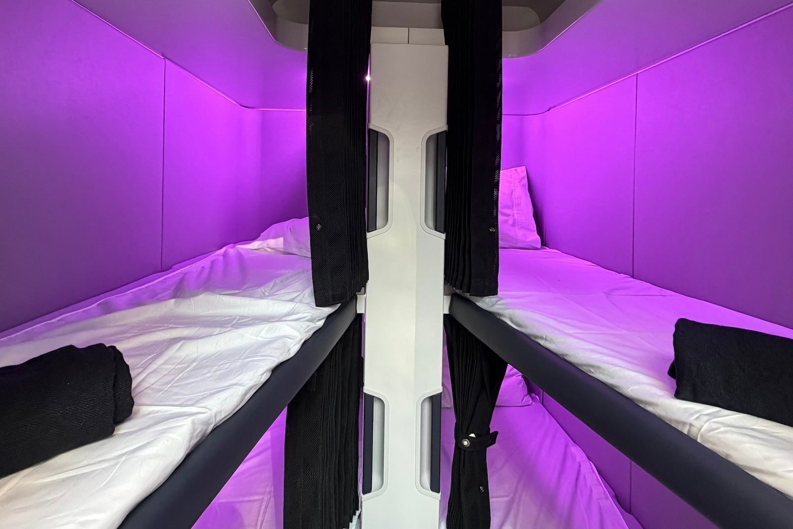 The bunk beds each have a USB-A and C charging outlet, and passengers who book will be provided fresh linens, a pillow, a blanket, socks (no shoes allowed in the real thing) and a "Nestcessities" amenity kit that will contain an eye mask, socks, earplugs and skincare products by New Zealand brand Aotea, plus a dental kit.