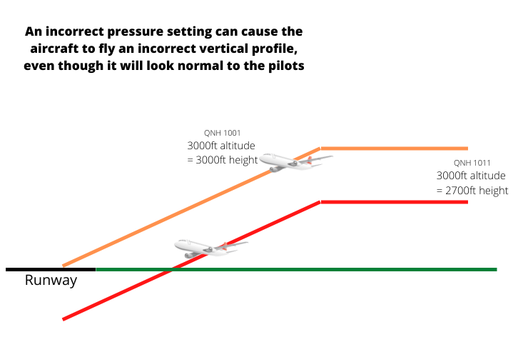 If the wrong pressure setting is used, the aircraft will create a vertical profile based on an incorrect height above the ground. This could result in the aircraft flying toward a touchdown point well short of the runway. The added threat here is that everything in the flight computer will match up with what is on the pilot's approach charts, lulling them into a false sense of security that what they are doing is correct.