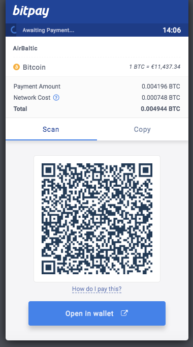 airBaltic — The Latvian carrier began accepting Bitcoin for payment in 2015 and utilizes BitPay as the payment processor. There's a "miner fee" attached to each payment, which is made by scanning a QR code.