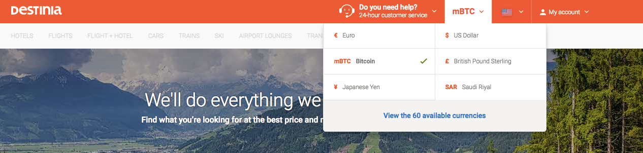 Destinia.com — The Spanish online travel agency accepts Bitcoin for flights, hotels and car rentals. Simply change the currency in the top-right corner to Bitcoin.