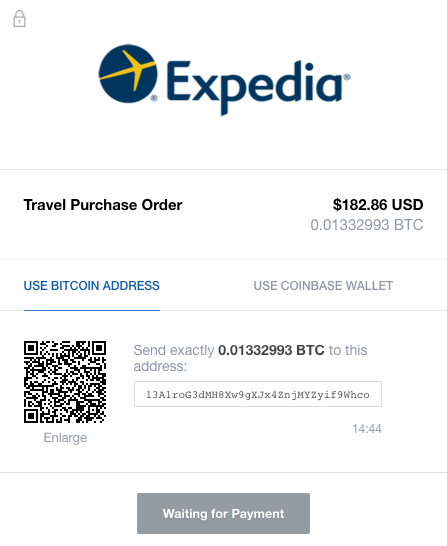 Expedia — The online travel agency only accepts Bitcoin for hotels (not flights) and uses Coinbase. You can send BTC to an address or use your Coinbase wallet to pay.