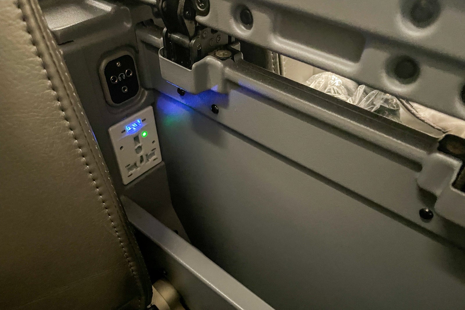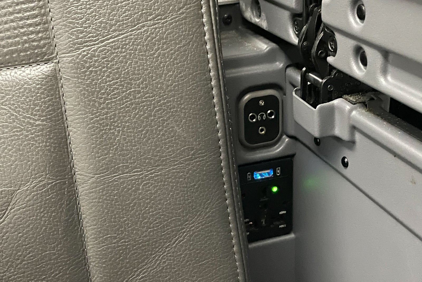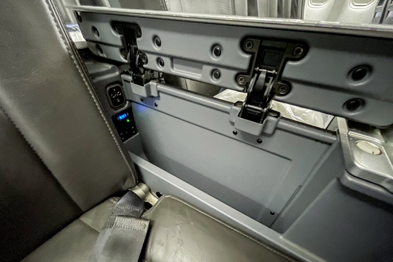 The other armrest had a flip-up lid covering a small storage space with a USB charging port and a universal power outlet. The design is not great, and accessing these plugs was far from easy. I have relatively slim wrists but still had difficulty accessing the plugs without contorting my body. Hopefully, in American Airlines' next iteration of these seats, it will incorporate more ergonomic placements for them.