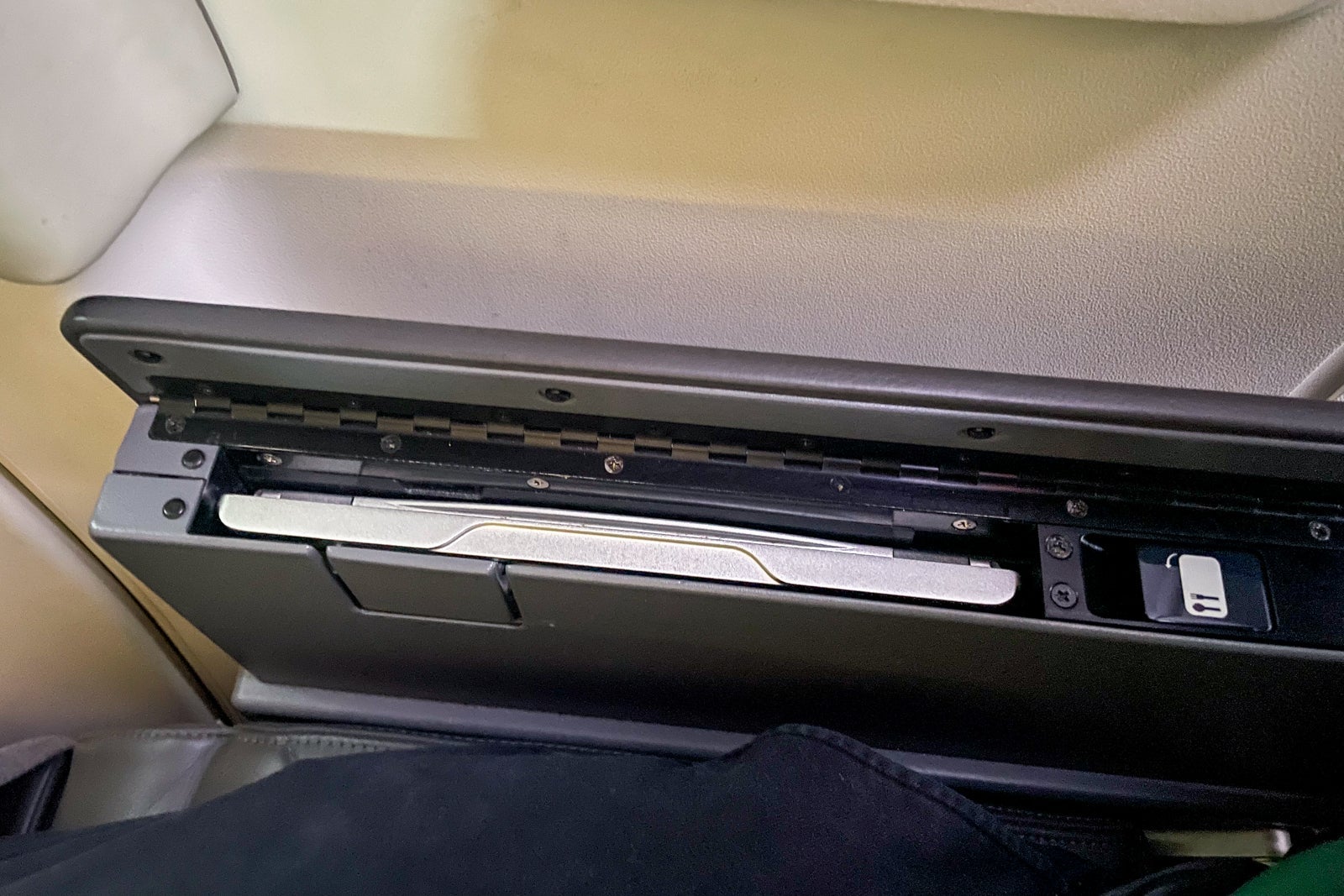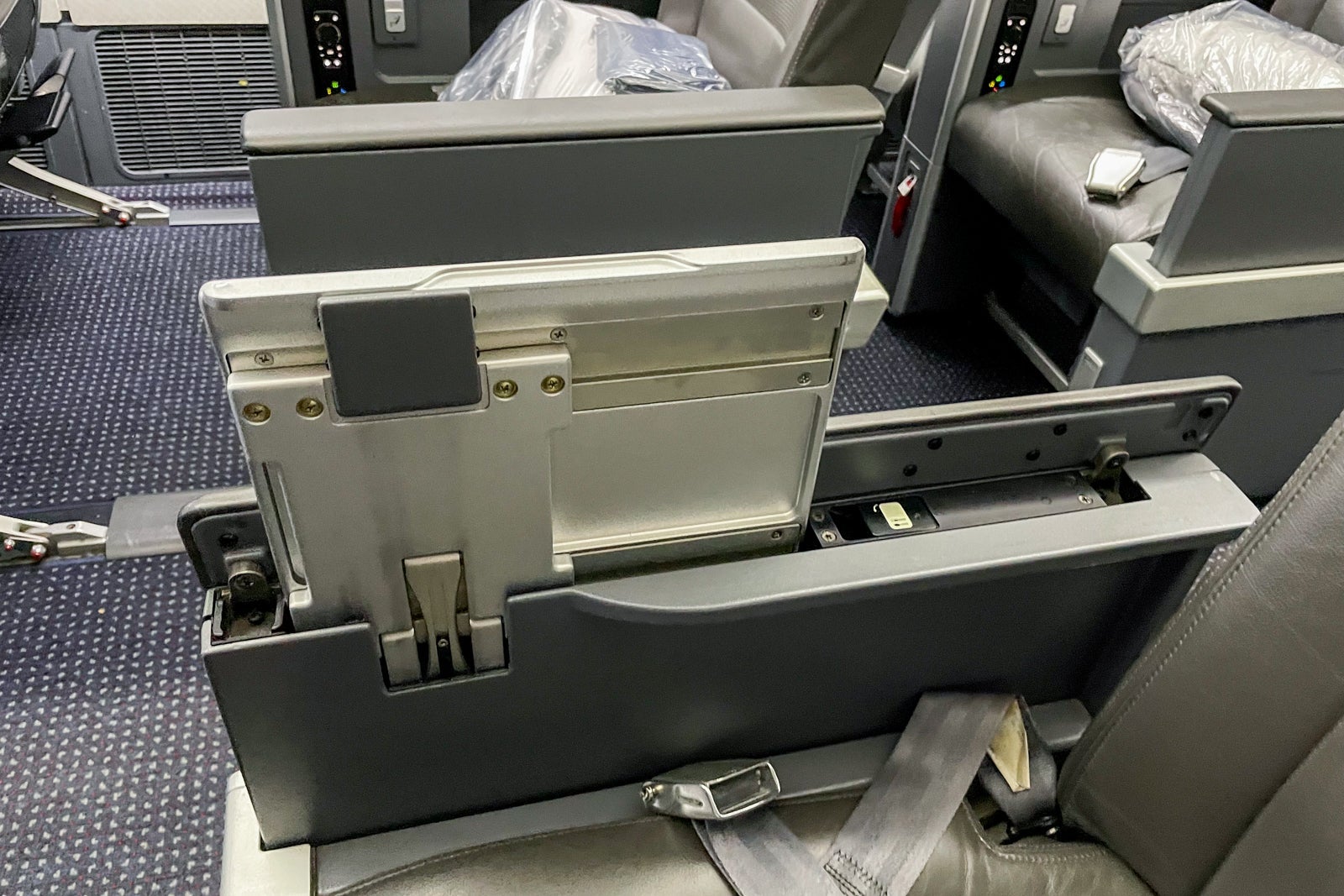 The inflight entertainment screens in this row were of the flip-up variety, mounted on a metal arm that swung out from beside the chair instead of the preceding seat's headrest. The setup is cumbersome and space invasive. When folded down, the screen reduces the seat width around your legs by roughly 2 inches, which could affect your comfort.