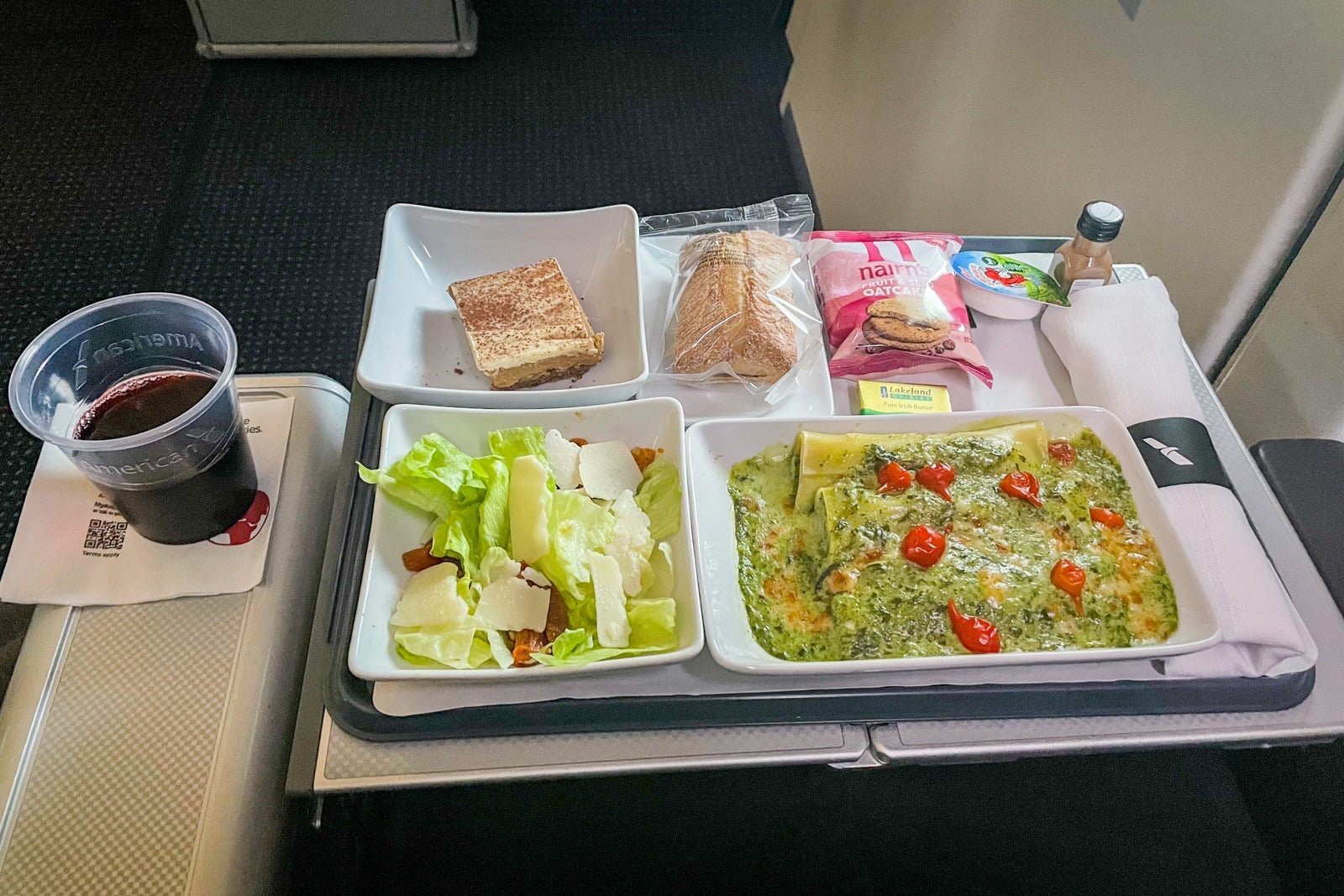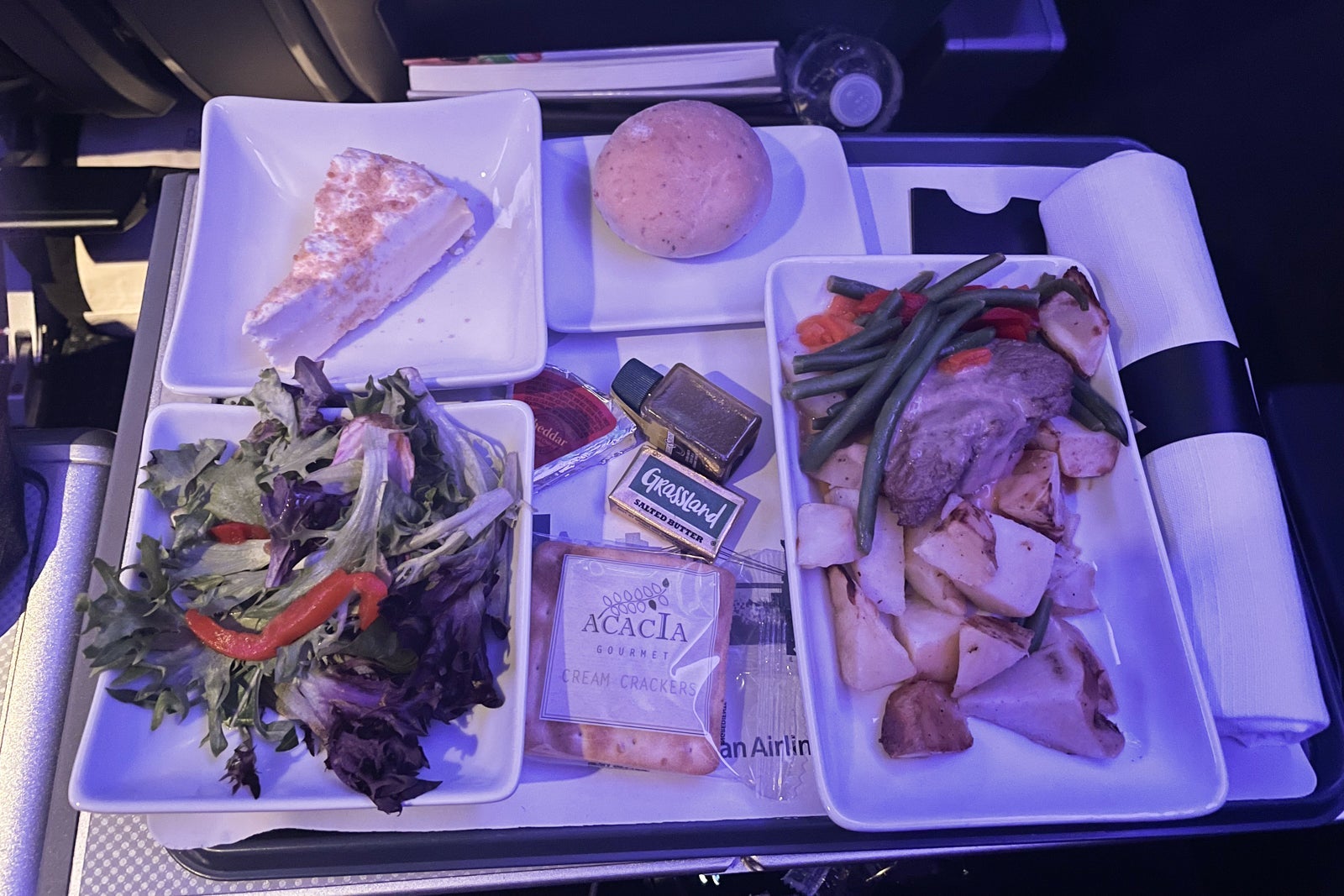 American Airlines premium economy meals are served on white china with metal cutlery, which certainly elevates the dining experience from your average coach fare. On both my departing and return flight, the main meal was served roughly 50 minutes after takeoff.