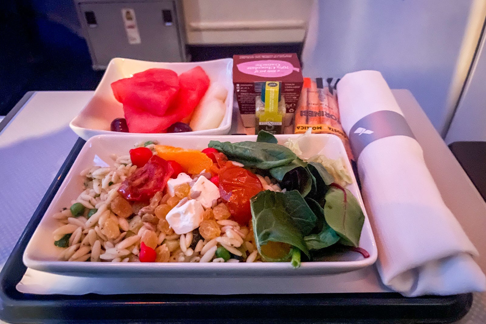 Flight attendants brought out a late meal of cold pasta salad and fruit an hour before landing. The pasta had a mix of sun-dried tomatoes, currants, feta cheese, peas, sweety drop peppers and oranges, the flavors of which didn't quite meld together. This was served alongside a plate of ice-cold fresh fruit, a refreshing distraction from the pasta.