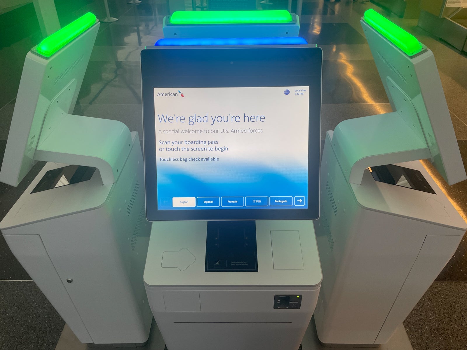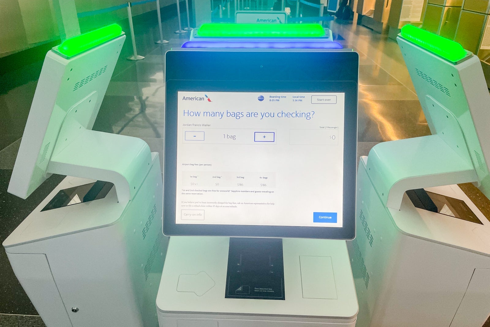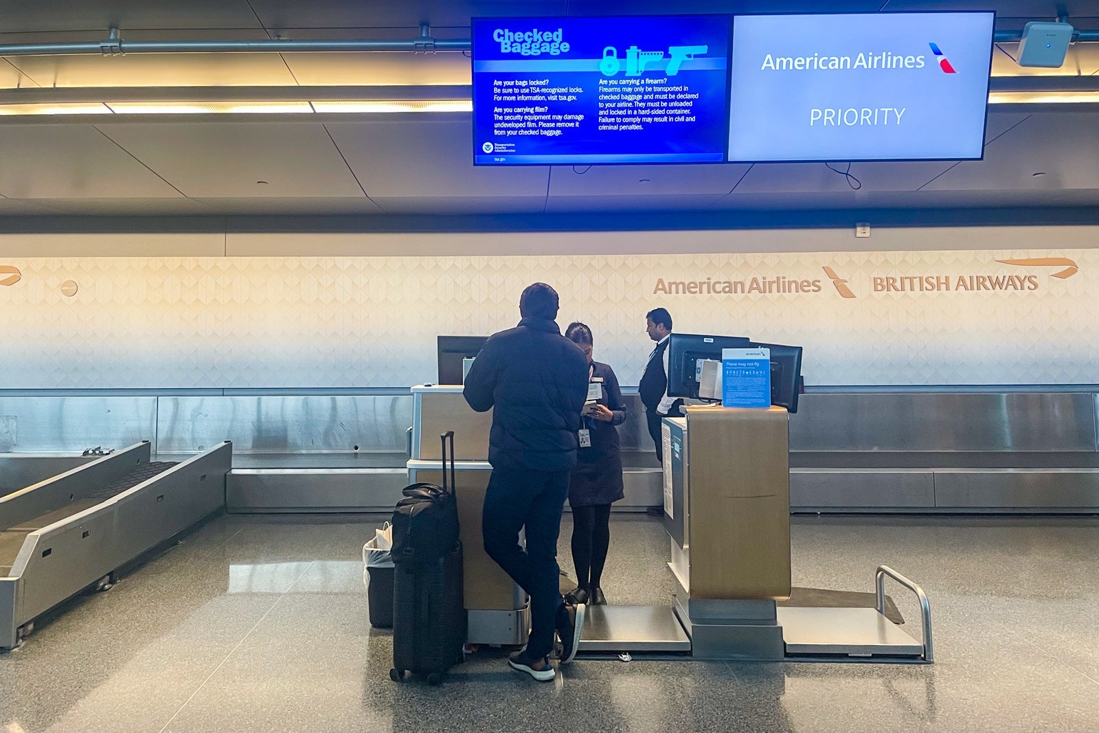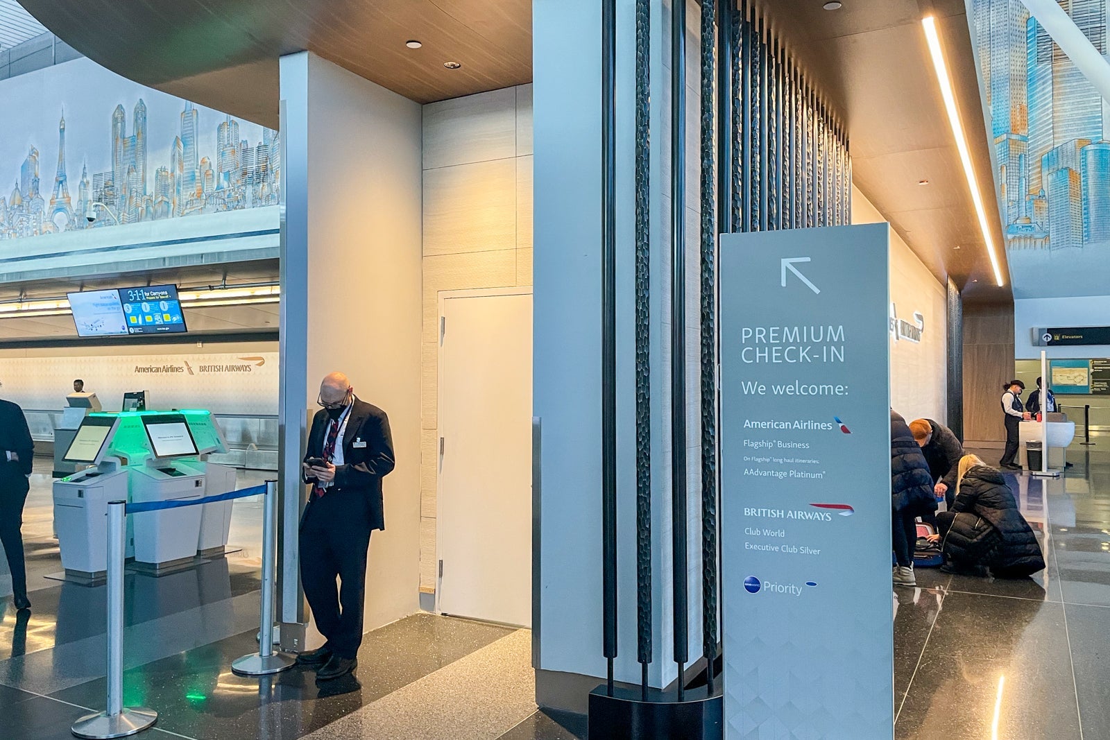 At JFK's Terminal 8, American Airlines has a closed-off area for priority check-in for passengers flying premium economy and Flagship Business with American Airlines, or Club World with partner airline British Airways. Outside of these fare types, you're also eligible to use this priority check-in area if you hold AAdvantage Platinum (and are flying long-haul) or Oneworld Sapphire/British Airways Executive Club Silver. The check-in area has the option to use self-service bag-check screens; during my trip there were zero lines since it was 5:30 p.m. and I was boarding an evening flight. Checking my bag was simple and the self-service kiosks were intuitive, with easy-to-follow instructions that even Luddites could breeze through.