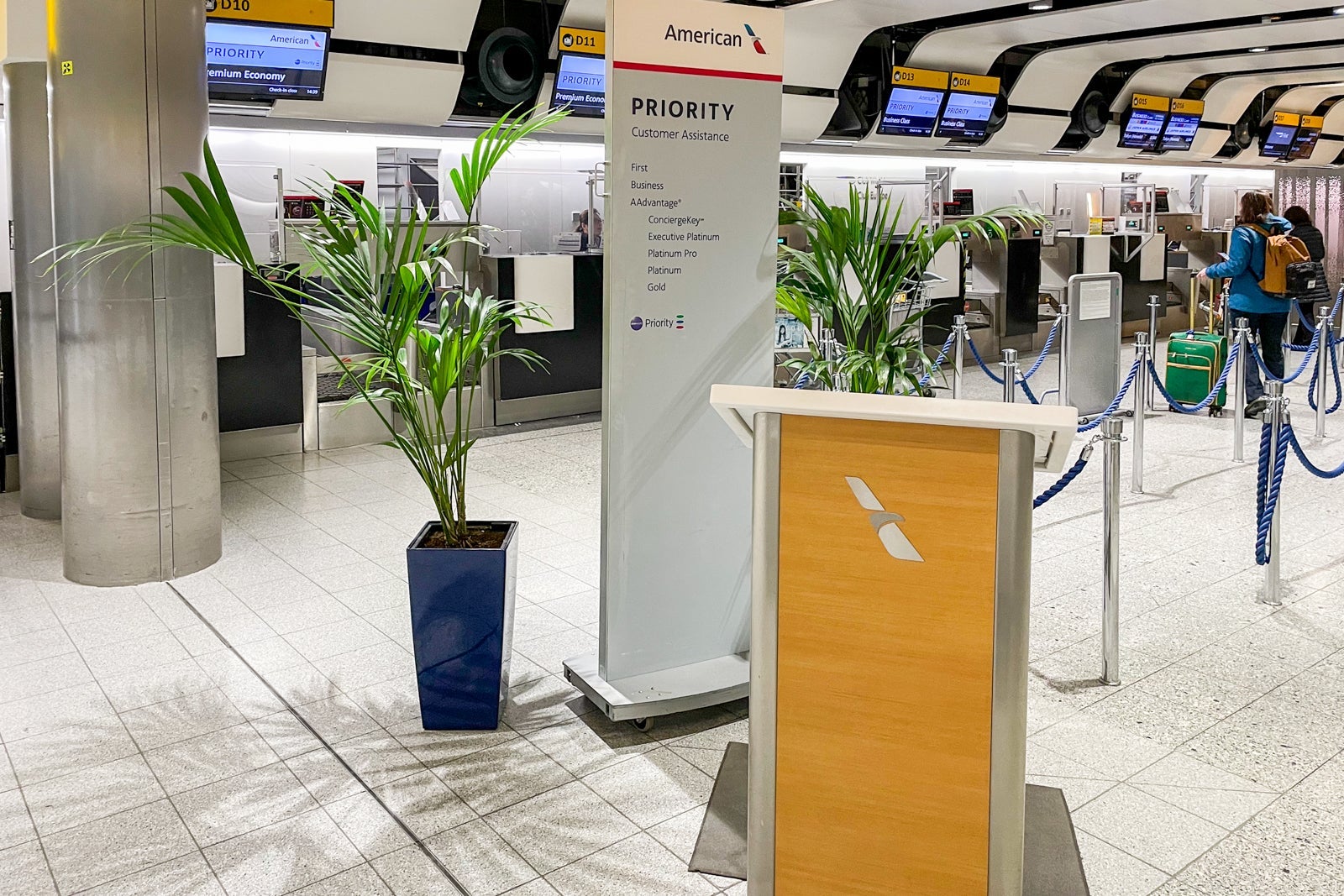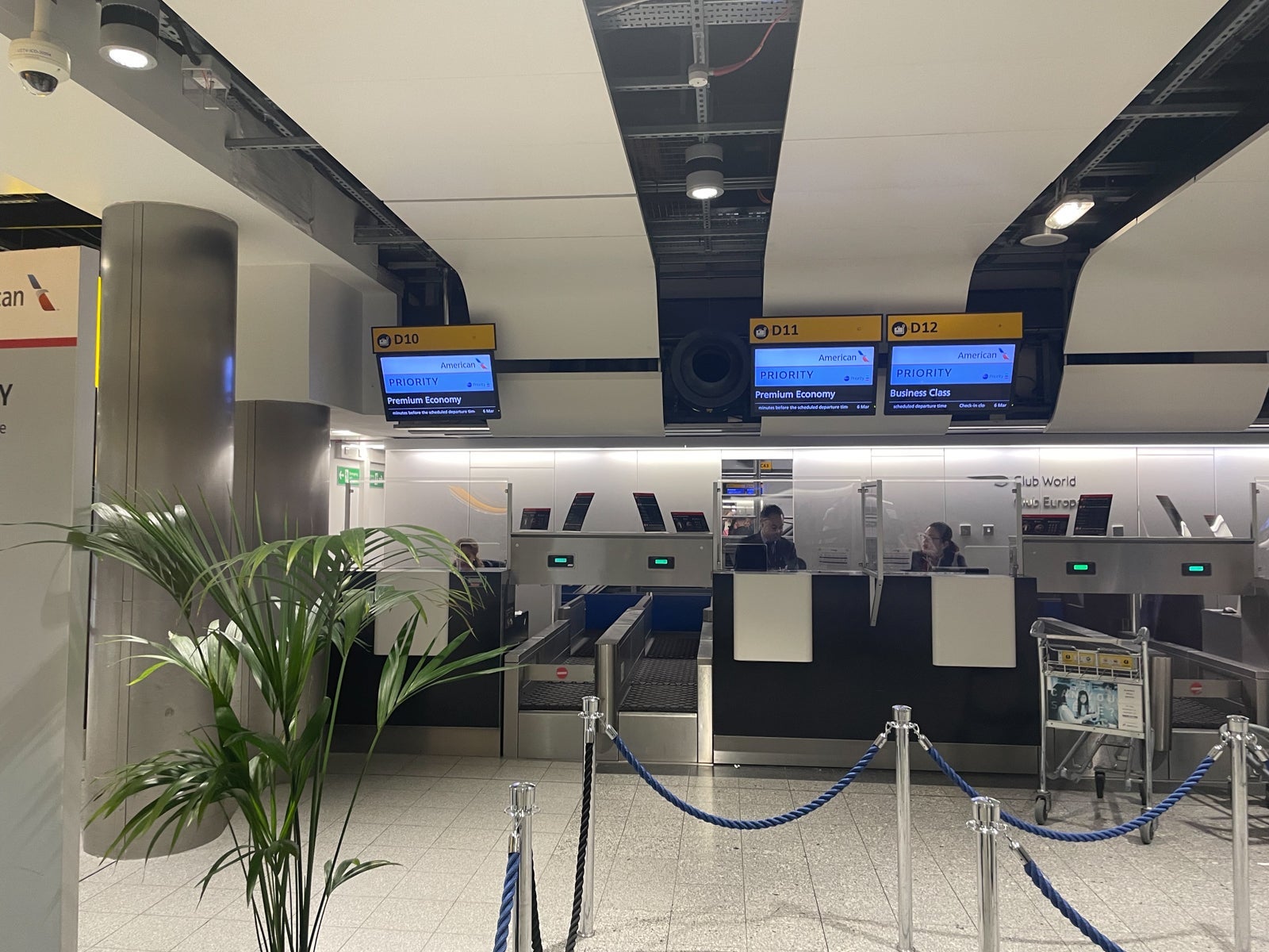 American Airlines operates dedicated desks at Heathrow's Terminal 3 for priority passengers. Along with premium economy ticket holders, the desks can be used by those flying in first and business and passengers holding Gold, Platinum, Platinum Pro, Executive Platinum and Concierge Key status with AAdvantage, and Ruby, Sapphire and Emerald status with Oneworld. The priority check-in desks are a short stroll from the desks for main cabin economy flyers. Service was quick, polite and hassle-free.