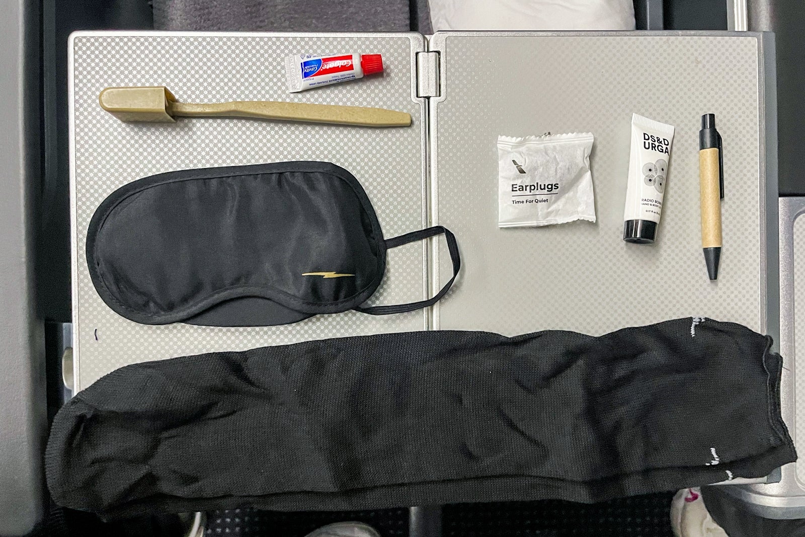 Premium economy passengers were also provided with a Casper sleep set consisting of a light blanket and medium-size pillow. The blanket is better suited to keeping you warm than the thin blankets in economy and is noticeably thicker. The pillow is elongated, making it easier to lock in place between the adjustable flaps on your headrest when you're trying to get some z's midflight.