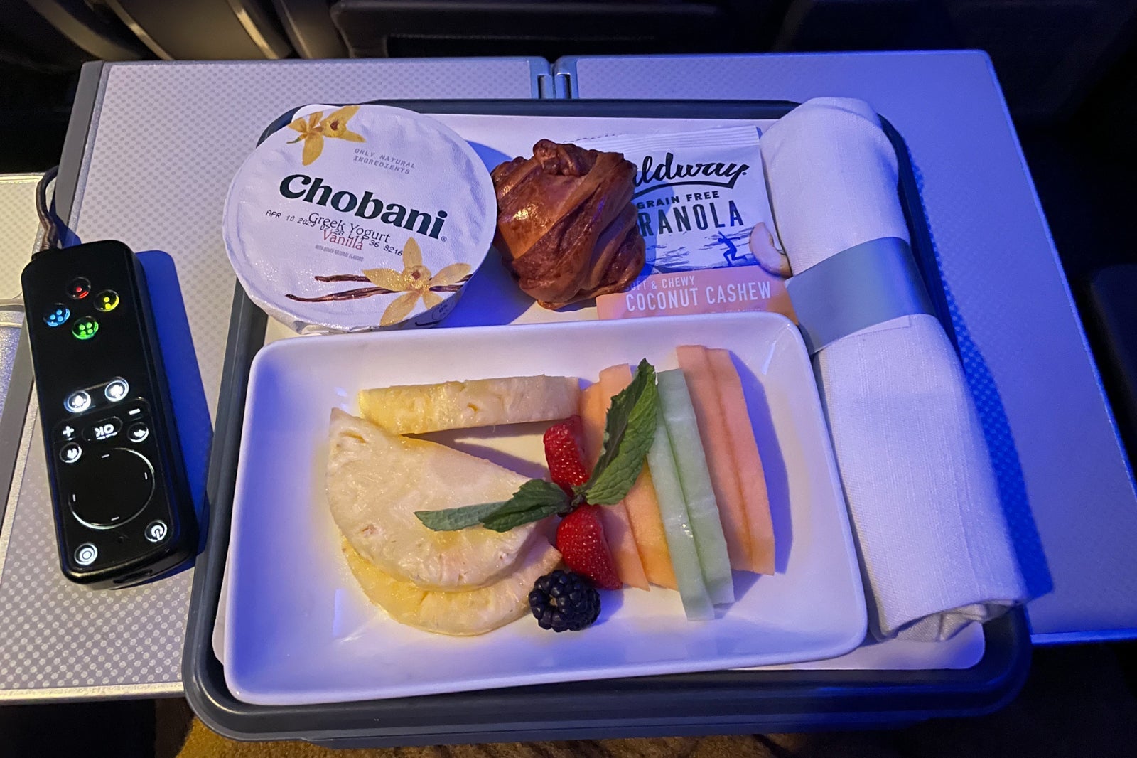 Breakfast was served around an hour before landing and was a plate of fresh fruit, Greek yogurt, a coconut-and-cashew granola cookie and a slightly hard croissant.