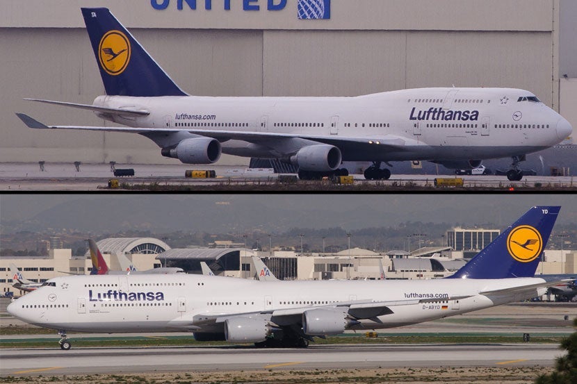 If identifying an A380 vs. a 747 was too obvious for you, try picking out the differences between several variations of the Queen of the Skies, Boeing 747. Originally debuting with Pan Am in 1970, more than 1,500 of these planes have rolled out of Boeing's factory over the last 47 years. Today, only two variants of this marvelous aircraft remain: the 747-400, introduced in 1989, and the 747-8I, introduced in 2011 — the "I" stands for "Intercontinental," to indicate it's the passenger-carrying version, while the 747-8F is the freight version. While the two airliners may look almost identical in every way, there are several details that differentiate them. First, the 747-400 features traditional, smooth cowling around each of its engines, while the 747-8I's is more modern-looking and jagged. Another key difference can be found in the wing style. The 747-400 has raised winglets at the tips, but the 747-8I has much more rounded wings, similar to those of the 787 Dreamliner. Finally, the 747-8I has four more windows on its top deck, with 22 on each side compared to the 18 you'll see on the 747-400.