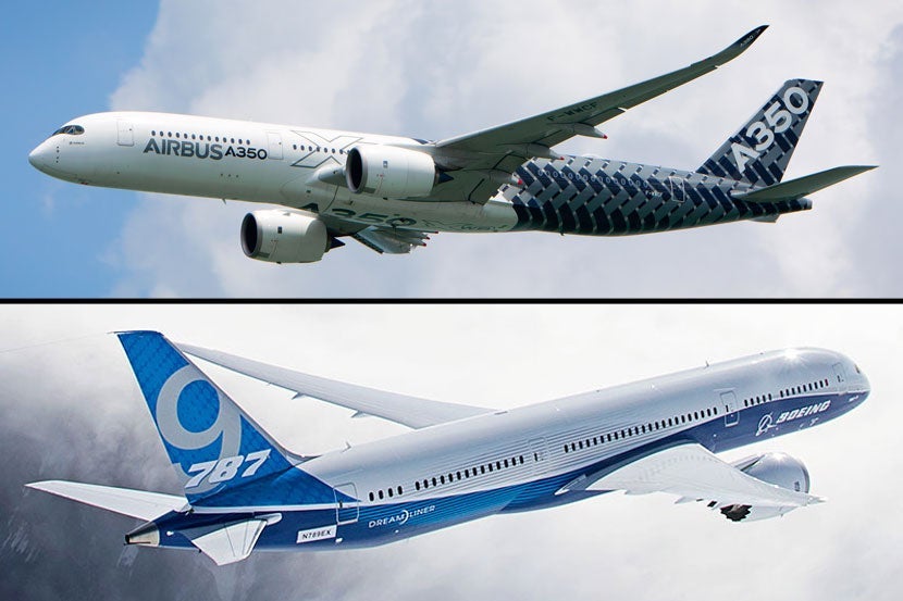 As with the jumbo-jet variants, deducing the difference between the two next-generation aircraft is all in the details. Launched several years apart from each other, the Airbus A350 and Boeing 787 Dreamliner represent the future of commercial aircraft, made primarily of composite materials and boasting better fuel efficiency than their predecessors. The key differences between these two can once again be found above and below the wings. First of all, the Dreamliner engine features a modern-looking removable cover with a toothy ring at the rear, surrounding what almost looks like the bottom of an ice cream cone — this is the exhaust cone, which controls the flow of the exhaust gases, which in turn reduces turbulence and increases the vessel's velocity. The A350's engines, however, are housed in more traditional coverings, with a smooth-ringed shell at the back around its exhaust cone. The A350's wings curve up at the end, forming winglets at the tips, while the Dreamliner's wings are sweeping and don't feature winglets at all. Finally, it all comes down to the nose: the A350's is pointy, while the 787's is more rounded.