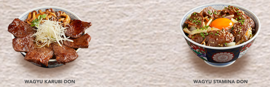 On the left, grilled Australian wagyu on rice; on the right, grilled miyazaki and Australian Wagyu with onions and Okinawa egg on rice. (Photo courtesy of Aburi-EN)