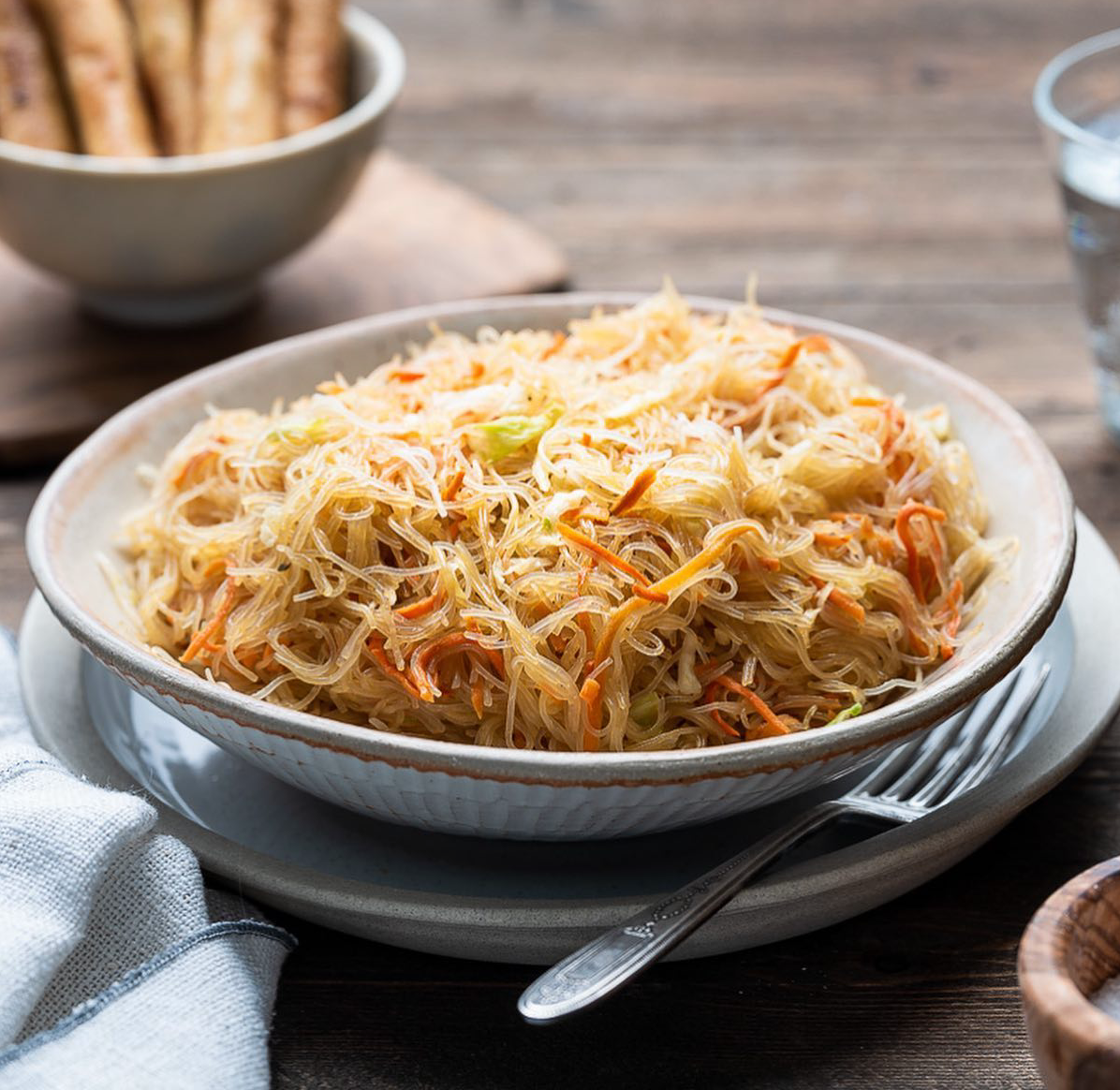 My favorite meal at Goldilocks: A bowl of Pancit Sotanghon glass noodles stir-fried with chicken and topped with veggies and egg and pork lumpia. (Photo courtesy of the restaurant)