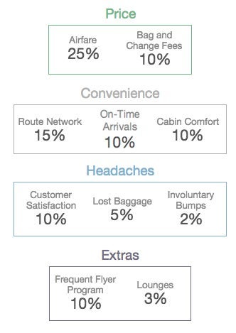 It's a well-known truism of the airline industry that the overwhelming majority of flyers book airline tickets based on two factors — price and convenience. So in developing our criteria — 10 themes across four major categories — we wanted to make sure those two factors got the greatest weight.