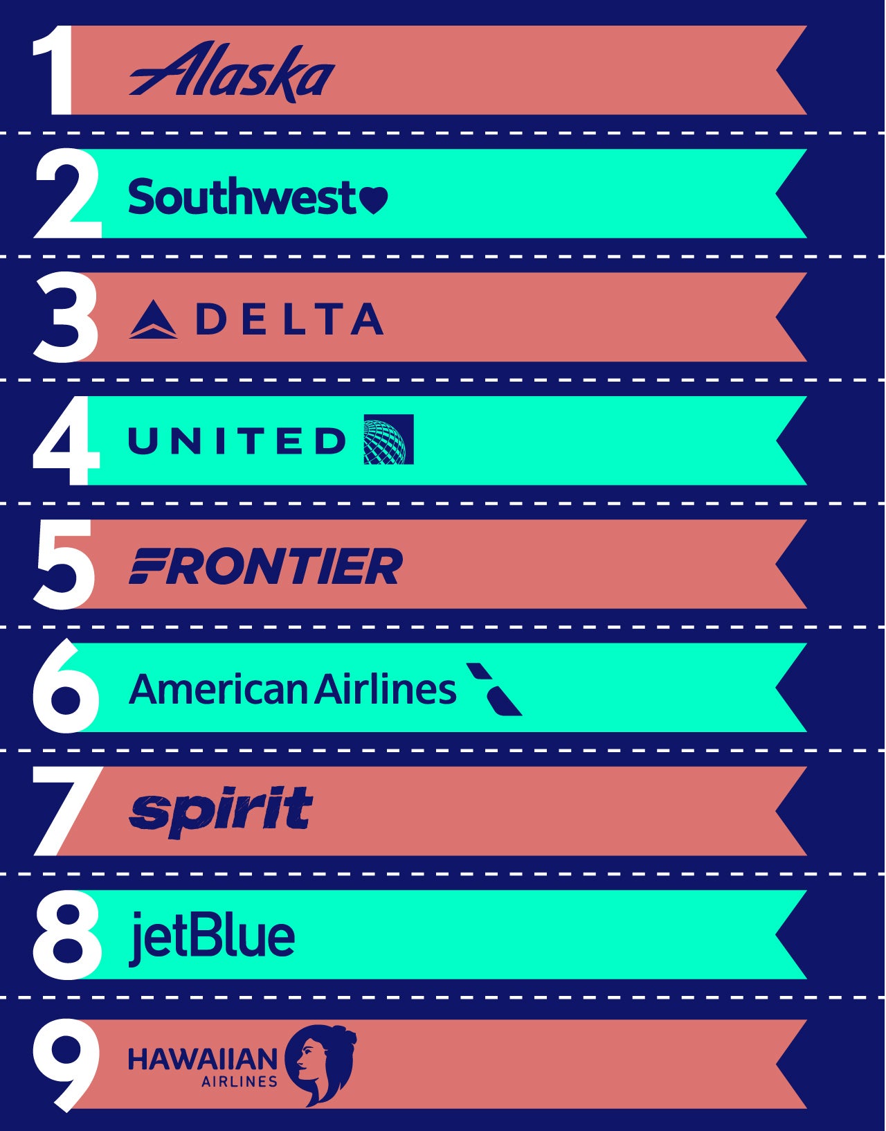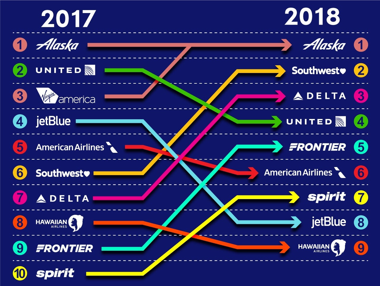 Several airlines in particular made significant moves from last year to this year, both upwards and downwards, and a number of our overall scores were extraordinarily close. Alaska is less than 1 point ahead of Southwest, while Delta and United are literally within a few tenths of each other, as are JetBlue and Spirit, and American and Frontier.