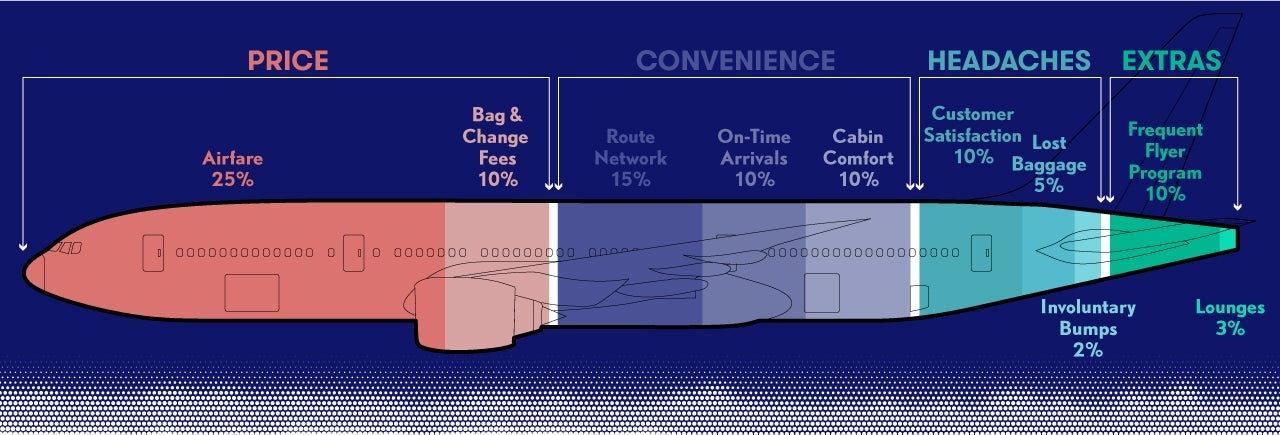 We've kept our weightings consistent from our previous study, as most passengers still book airline flights primarily based on Price — comprised of both airfare and baggage and change fees — and Convenience, which includes the size of an airline's route network, on-time performance and cabin comfort. A smaller subset of road warriors value Extras such as lounges and frequent flyer miles, and of course everyone hopes to avoid those dreaded Headaches like lost bags, bad customer service and getting bumped (though hopefully not dragged off the plane as well).