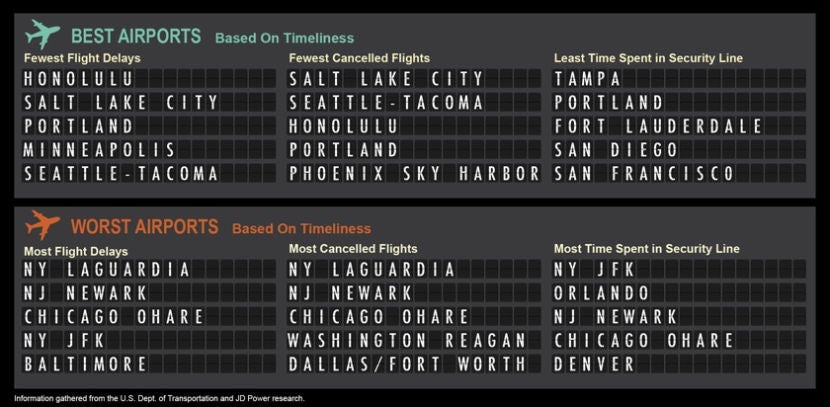 The worst non-New York-area airport, Chicago O'Hare, is a slog: It shows high rates of delayed or cancelled flights, and a long wait in security, to boot. The fifth-worst airport makes its home near the Motor City. Detroit's public transit rating is simply shameful — in this era of eco-consciousness, there's no reason it should take someone in a modern major American city two transfers and over 100 minutes to go from the city center to the airport via rail or bus. (It's a half-hour drive.) Denver, meanwhile, takes a long time to get to by any means, and passengers there have to deal with the fact that there's more than a one in five chance that a flight will be delayed (sadly, this is not far from the average).