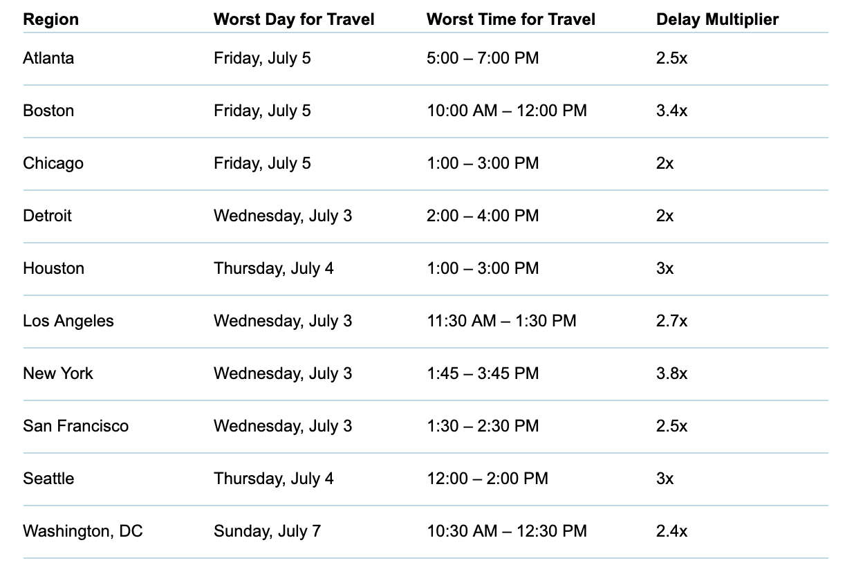 New York City-area drivers should brace for the worst delays, especially during the afternoon of July 3. Boston traffic delays could be nearly three-and-a-half times as bad as normal, but the worst hours for travel will be on Friday, July 5 between 10am and 12pm (so get a super early start or sleep in and wait to leave until after lunch). Seattle will be the third-worst city for traffic delays, with the worst congestion between noon and 2pm on Thursday, July 4.
