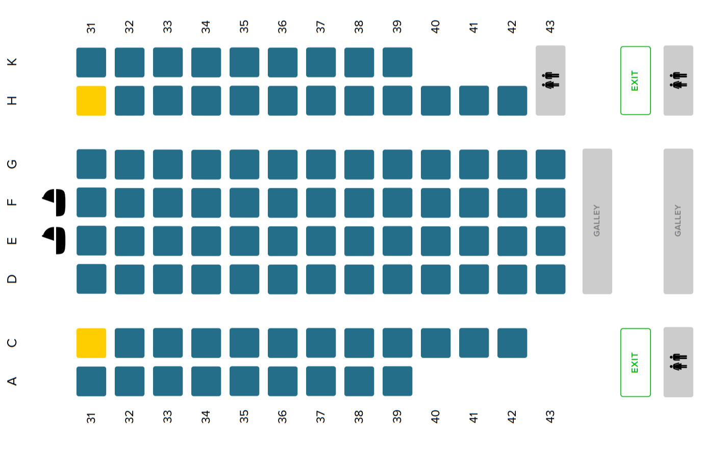 From my experience, there are two clear winners for the worst seats in the cabin: 43F and 43G. Seat 43G is set right across the aisle from one of the rear lavatories, meaning there's going to be plenty of commotion from passengers going in and out of the bathroom. 43F is almost as close while also being a middle seat.