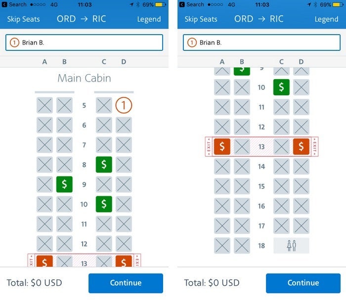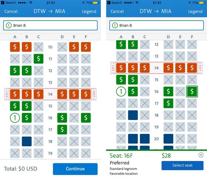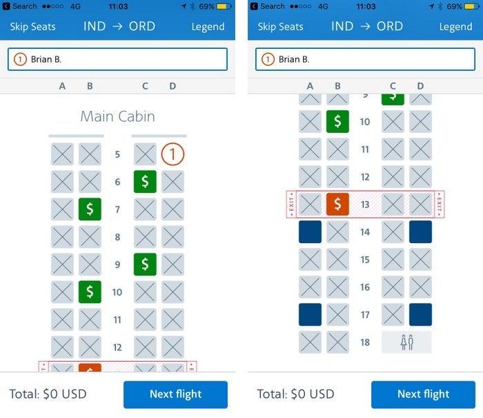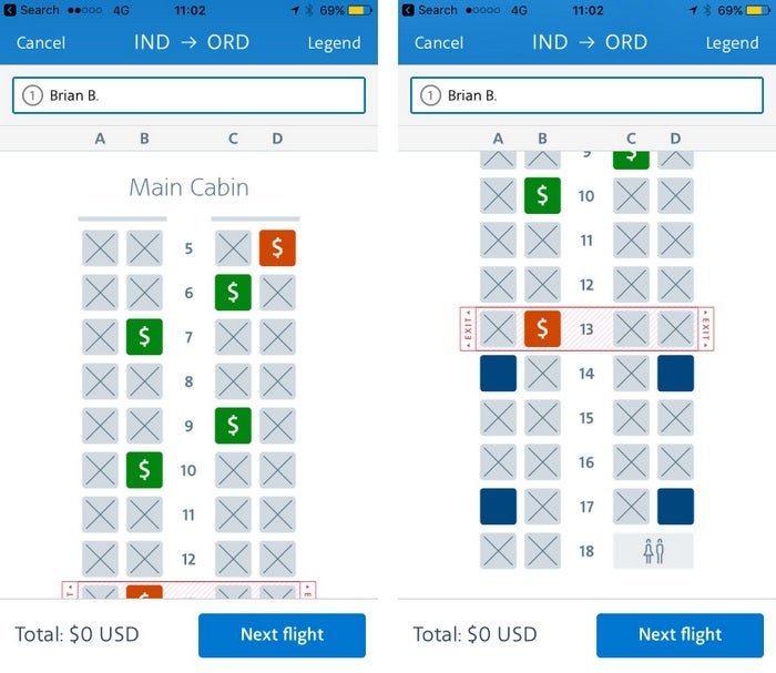 On the left, the Preferred seat I was assigned after check-in for free. On the right, what it would have cost to change to an identical seat across the aisle.