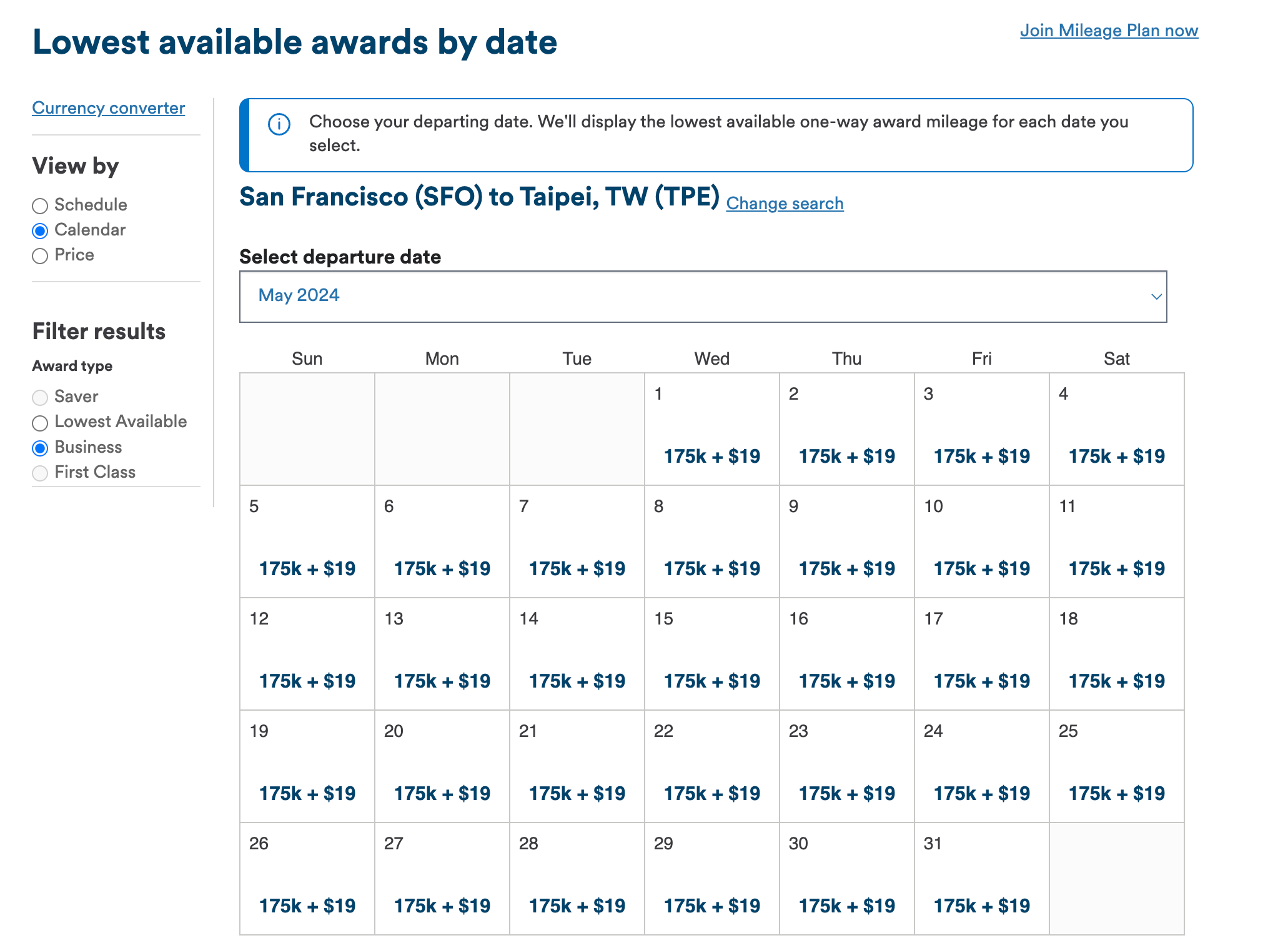 However, on almost all dates, while the 37,500-mile amount in the economy and the 50,000-mile amount in premium economy are readily available, business class is priced at 175,000 miles each way, whether searching at the last minute or well in advance.