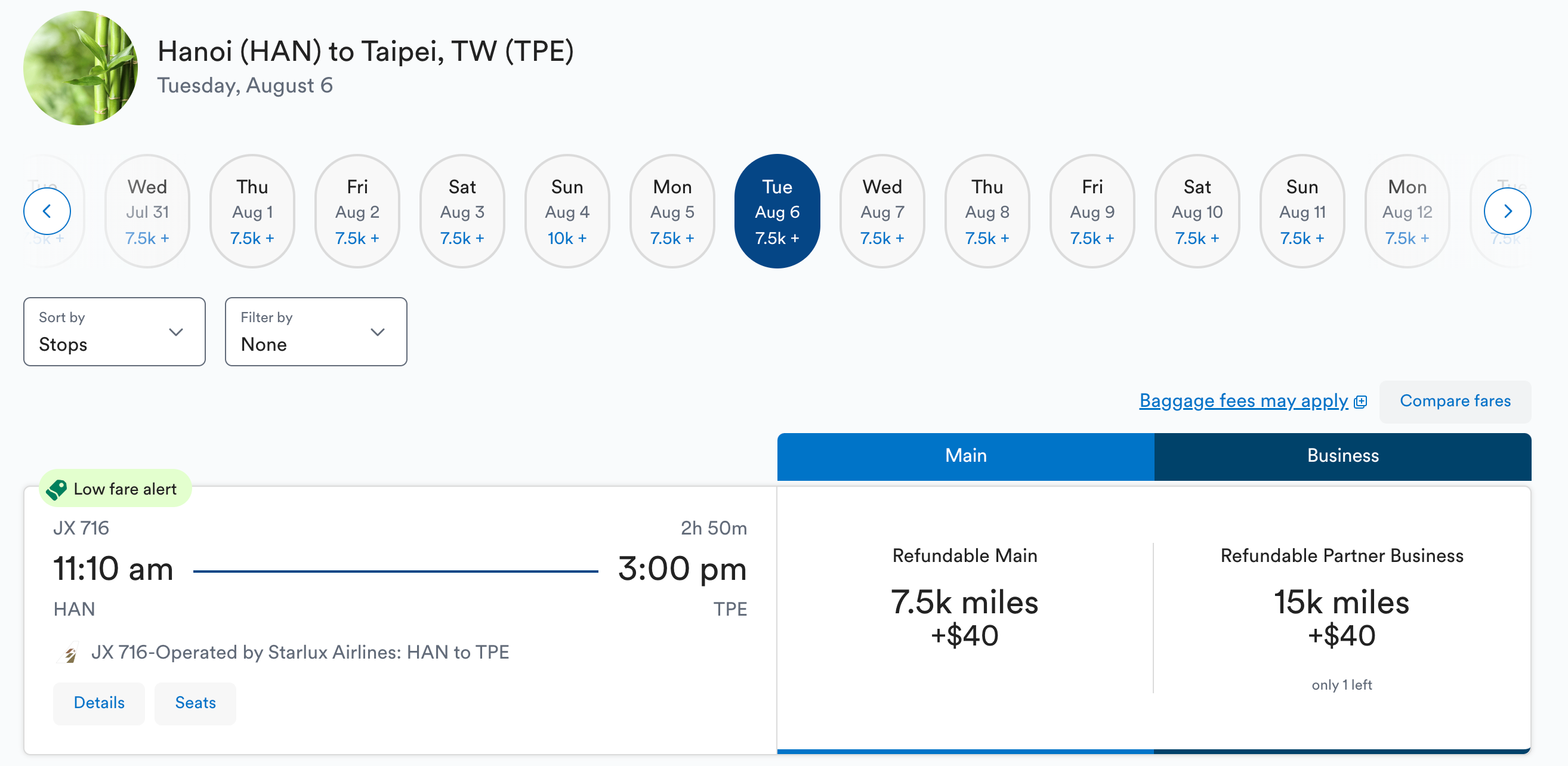 Fortunately, if you want to travel within Asia on Starlux, redemption rates are 7,500 Alaska miles in economy and 15,000 miles in business class for short-haul flights, with excellent availability on virtually all flights.