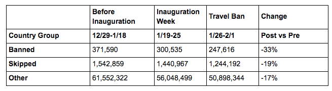 Flying into the US is also a terrible experience for US citizens and visitors alike. Not only are there long wait times for customs and immigration, we don't have the infrastructure to allow people to check bags through to final destinations. So if you want to travel from London to Grand Cayman via Miami, you need to recheck your bags after immigration, even though you aren't leaving the airport. Add in the recent proposed travel ban — which was subsequently blocked by the courts — and you have not only a very unfriendly image of travel to the US, but also a decrease in tourism dollars. A recent Financial Times story points out that flight searches for the US has dropped dramatically since the proposed travel ban: