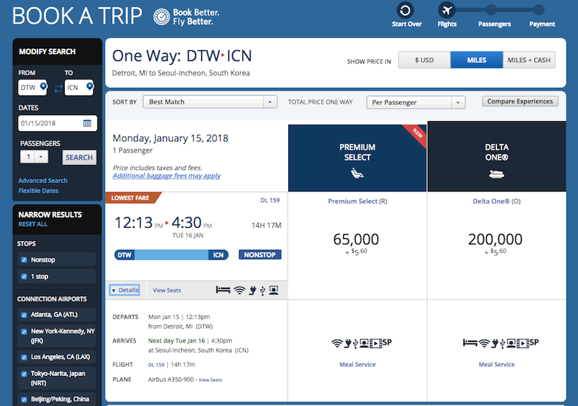 Using miles: The good news is that you can search specifically for Premium Select awards and use miles to book them on Delta's flights to Asia. The bad news is it'll cost you a lot of miles. 65,000 each way, to be exact, whether you're going to Beijing, Tokyo or Seoul.