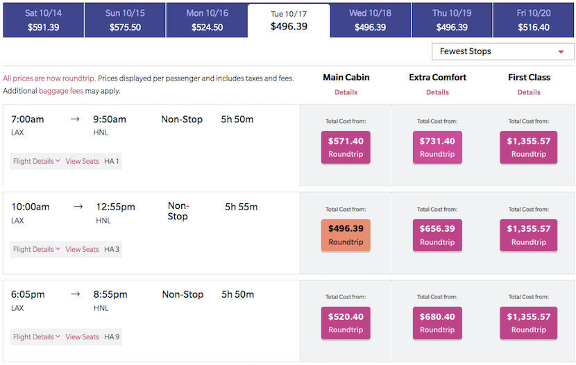 You can see that pricing structure in the sample flights above from Los Angeles–Honolulu where the round-trip price of Extra Comfort comes to $160 more than regular Main Cabin.