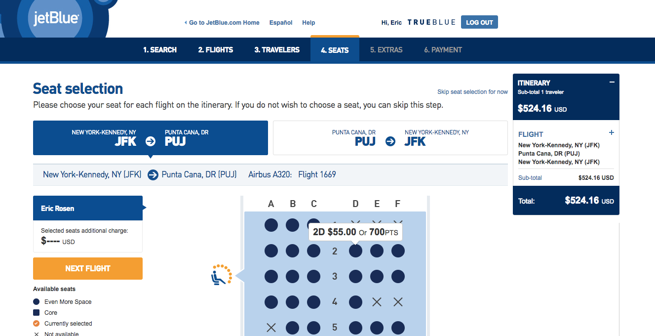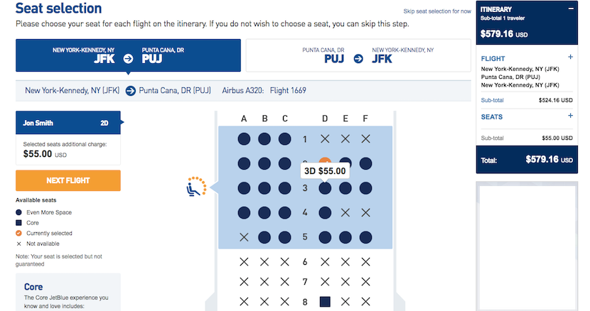 Using miles: The cost of purchasing Even More Space seats depends on airfares and your route. For instance, this flight from New York (JFK)–Punta Cana (PUJ) in the Dominican Republic costs $524, and upgrading to Even More Space costs $55 each way.