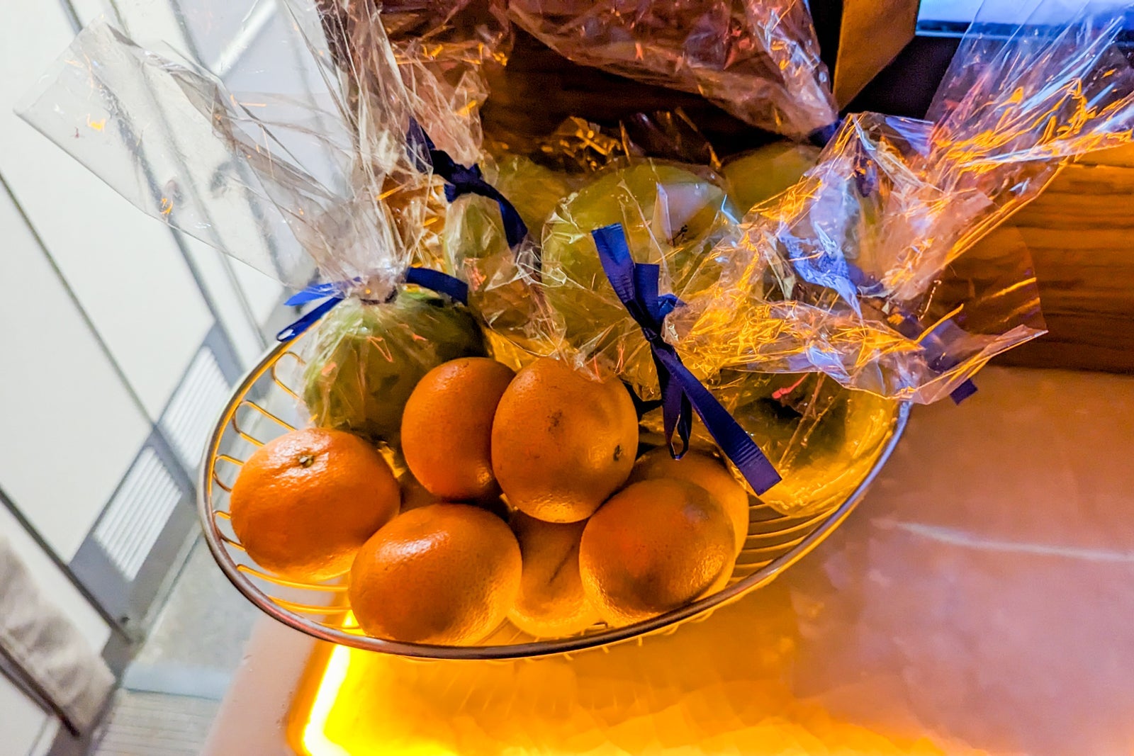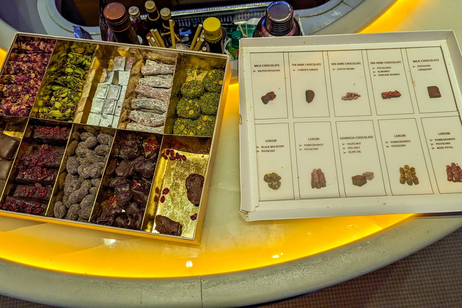 A comprehensive range of sweet and savory snacks, light bites and fresh fruit are also provided, both on the bar itself and the rear wall between the bathrooms. These will differ depending on the origin, the destination, the time of day and the length of the flight but may include carrot cake cupcakes, jelly beans, M&Ms, apples, savory mixed nuts, a full-size lemon cake and traditional Arabic sweets.