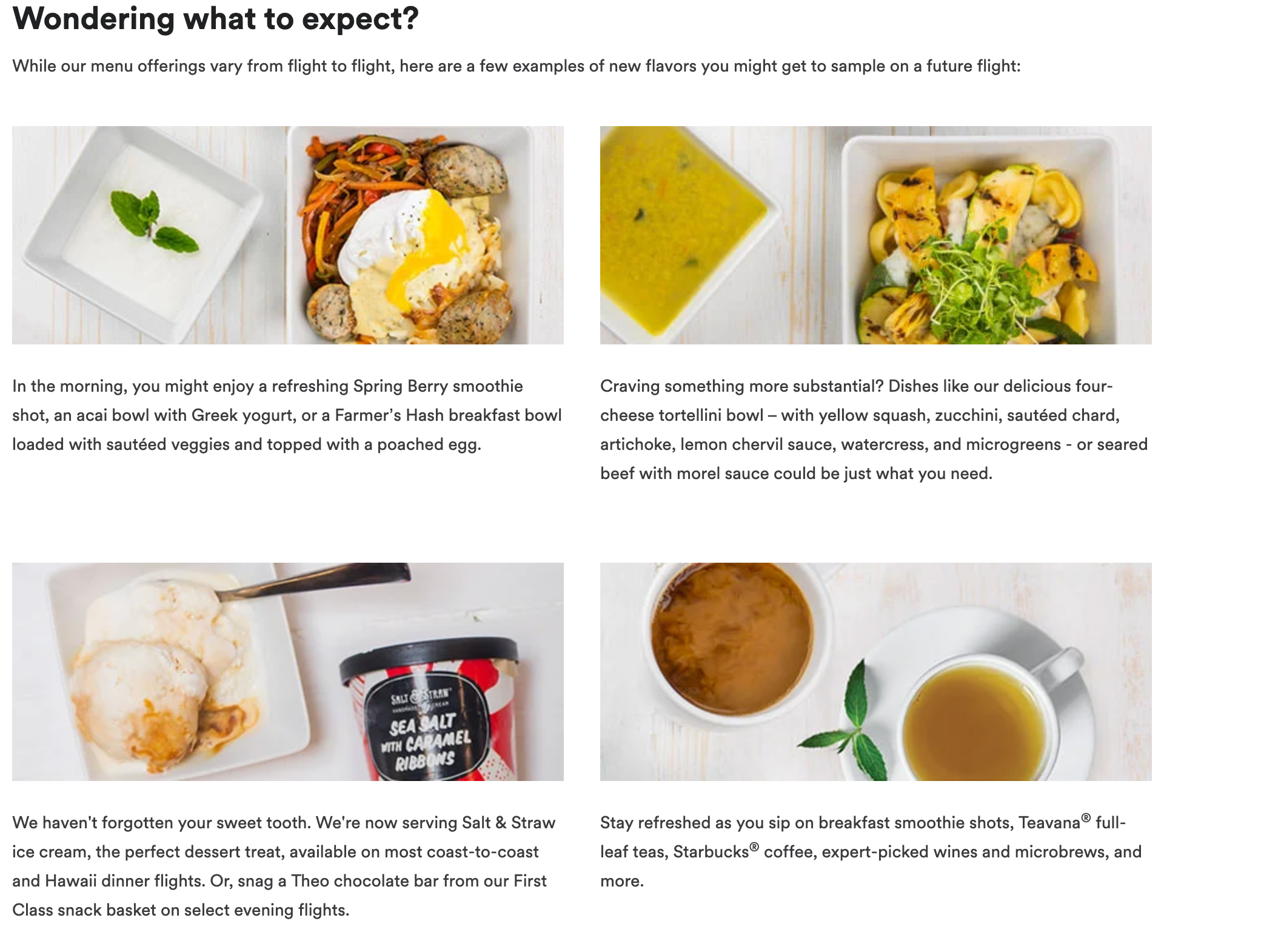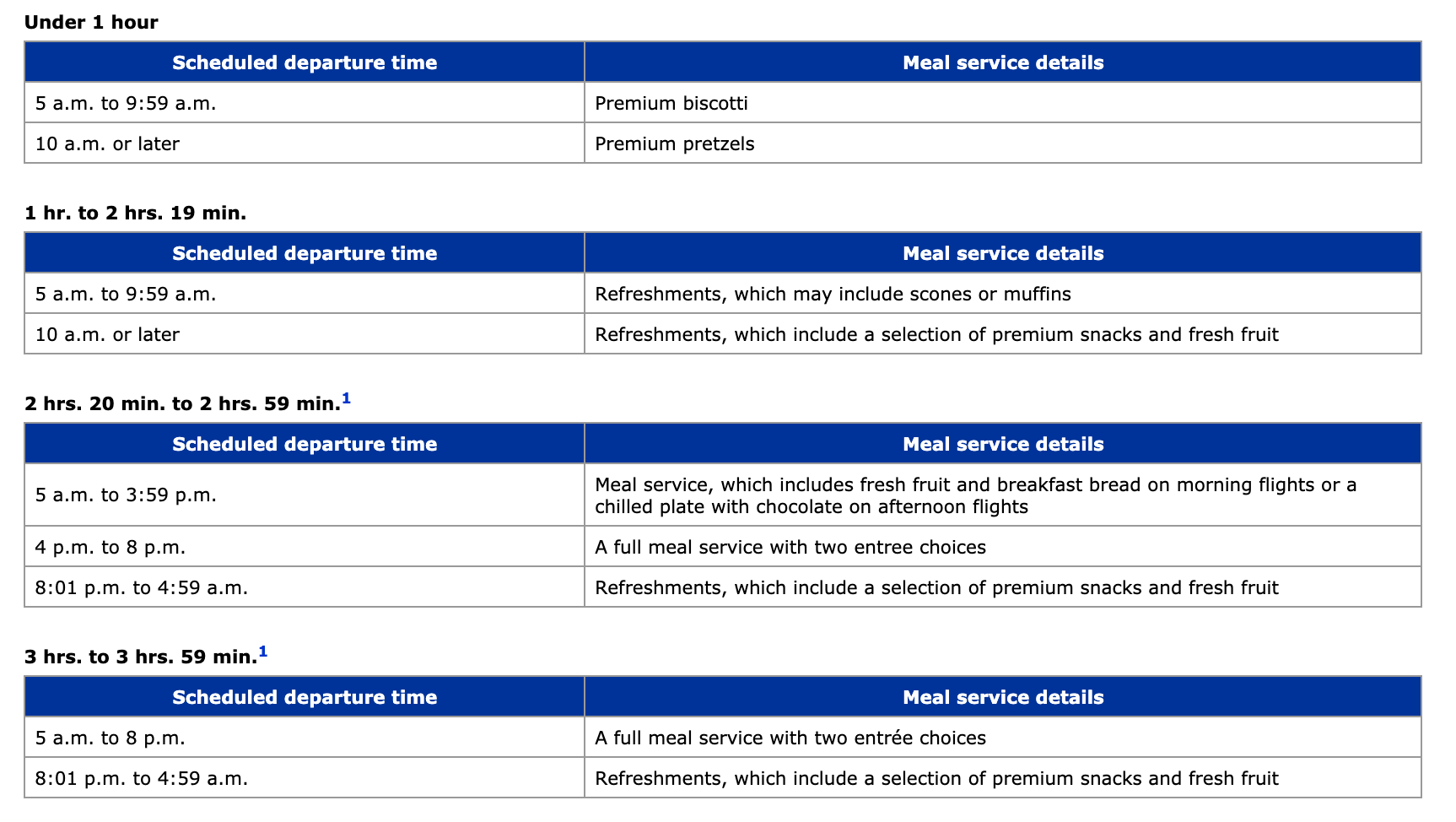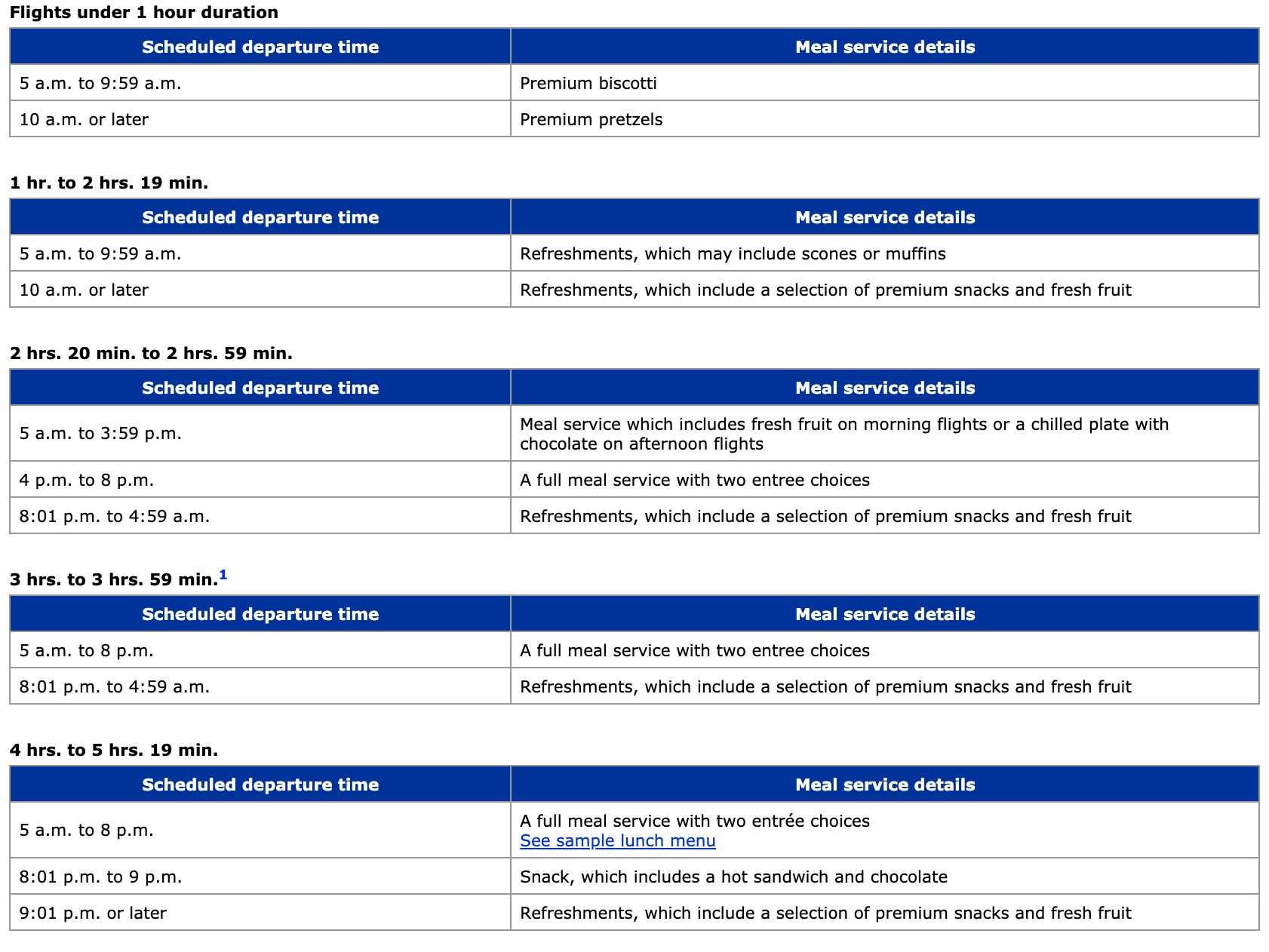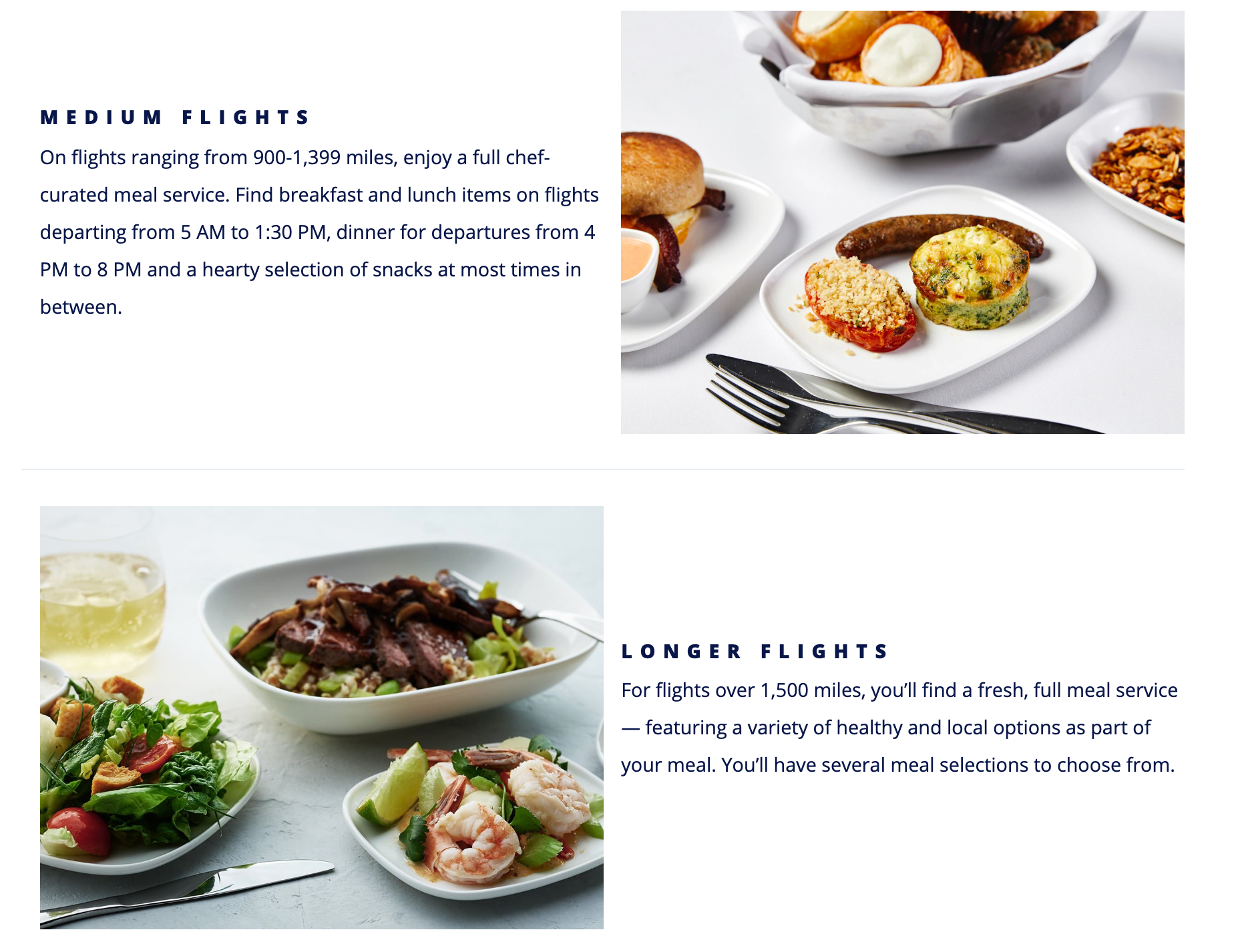 Unlike the dozens of different flight categories on American, Delta keeps things simple by splitting flights into short (under 900 miles), medium (900-1,399 miles) and long (over 1,500 miles). Short flight menus are relatively skimpy, offering only "savory and healthy snacks," even on popular routes.