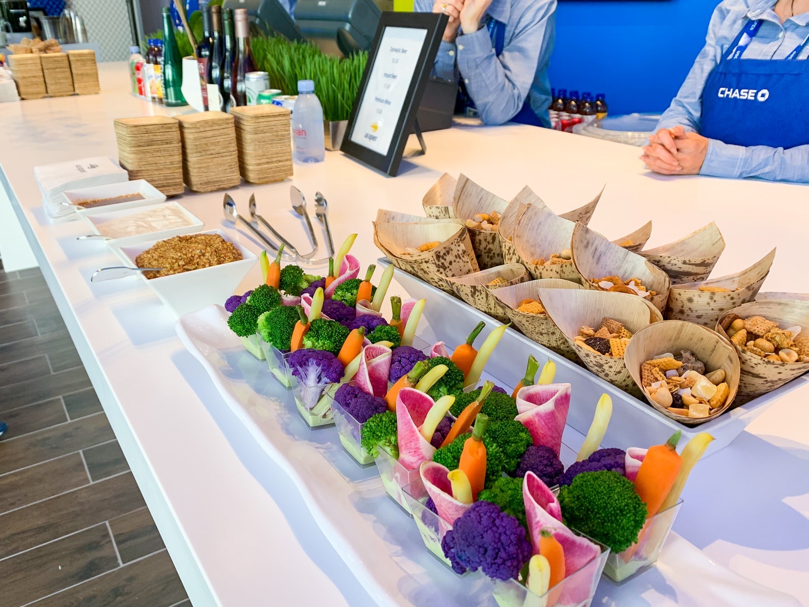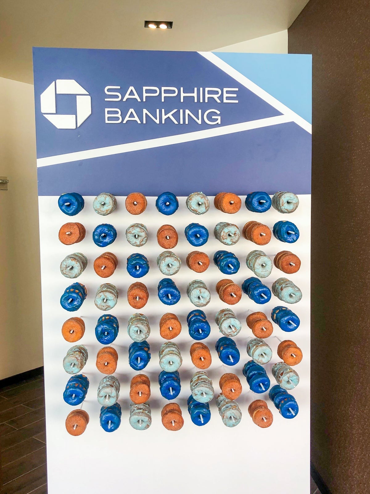 There's another beverage bar near the lounge entrance with hot coffee, tea and cold brew(!). In keeping with the tennis theme, Chase created its blue octagonal logo out of tennis balls.