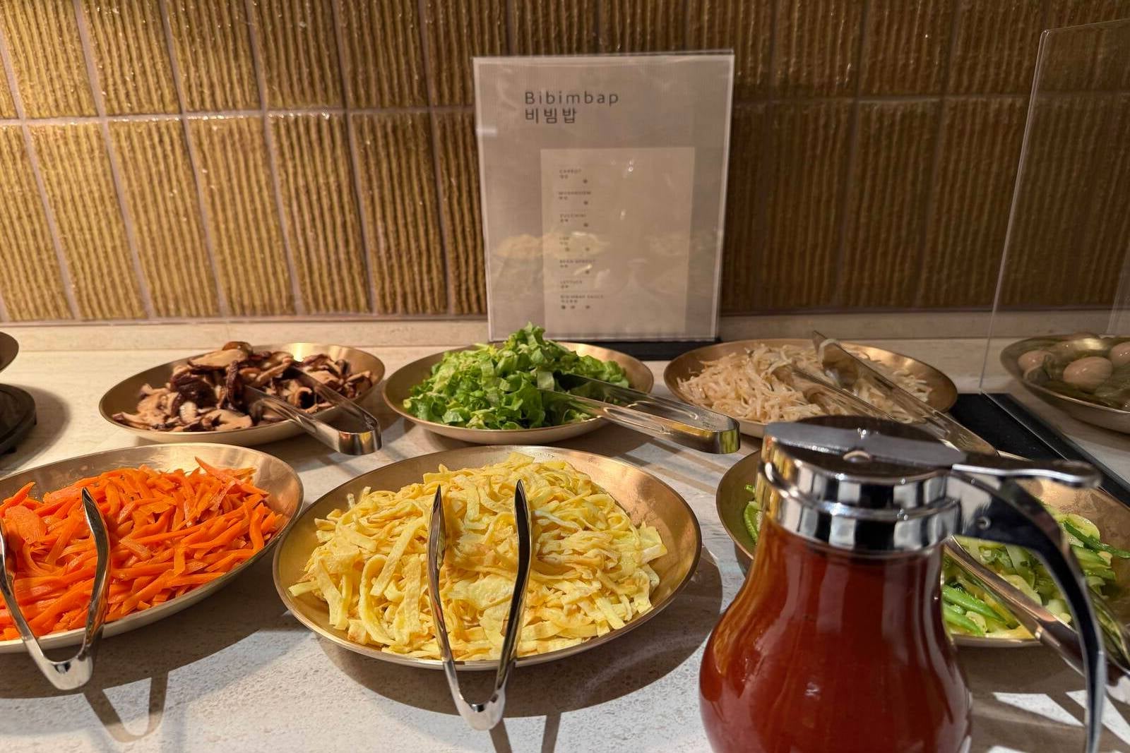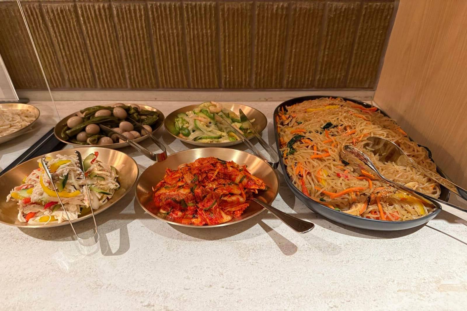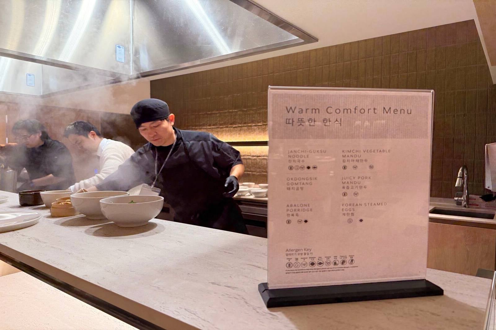 Downstairs, the Prestige Class lounge features an open kitchen with live stations producing fresh dishes throughout the day. At my evening visit, the "warm comfort" section highlighted Korean cuisine, including janchi-guksu noodles, kimchi vegetable mandu, abalone porridge, Korean steamed eggs and a build-your-own bibimbap station.