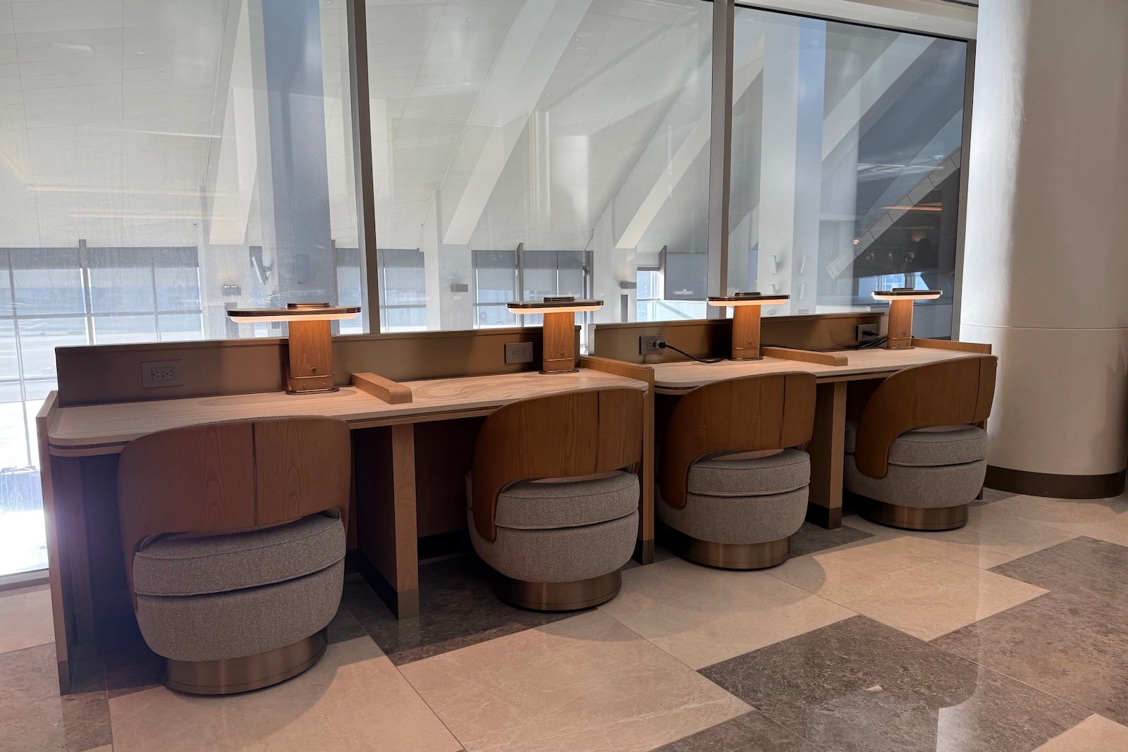 This is the primary space for most premium passengers, featuring various seating vignettes and two- and four-top dining tables, soft lounge chairs near the windows and tech-friendly work zones equipped with universal power outlets, USB-A and USB-C ports and dedicated quiet spaces.