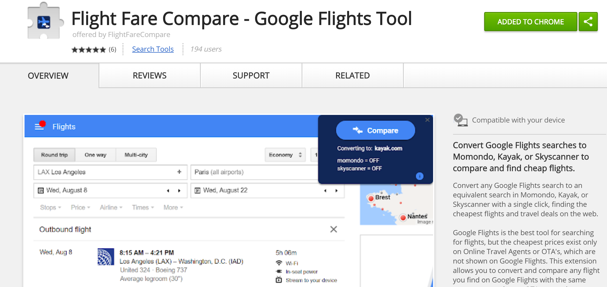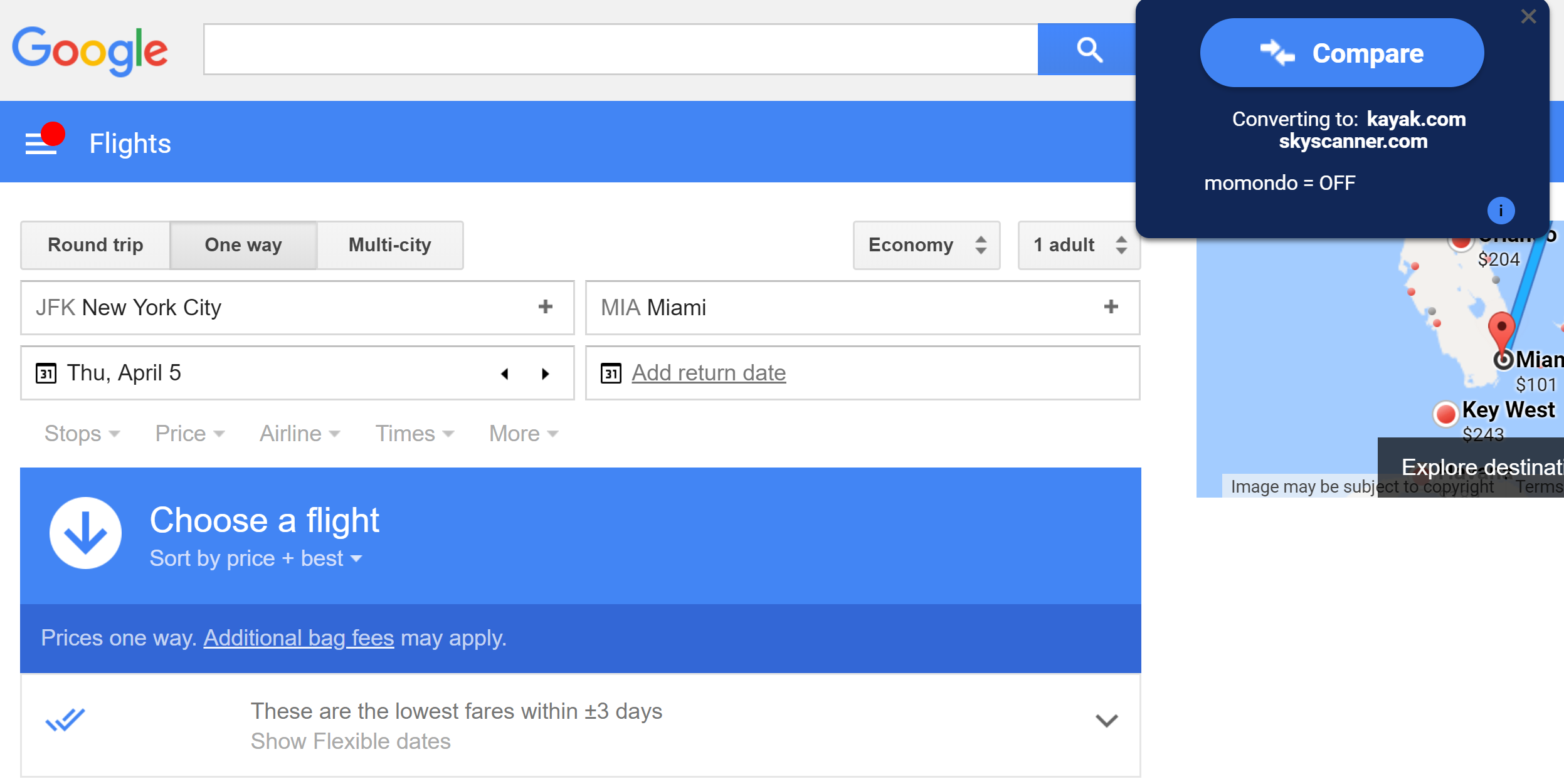 Now, there's another extension that helps you book your flight for the cheapest price. Flight Fare Compare is a Chrome extension that helps you easily compare the search results you find on Google Flights with fares for the same flights via Momondo, Kayak and SkyScanner.