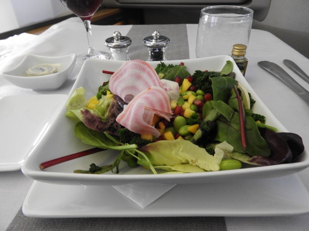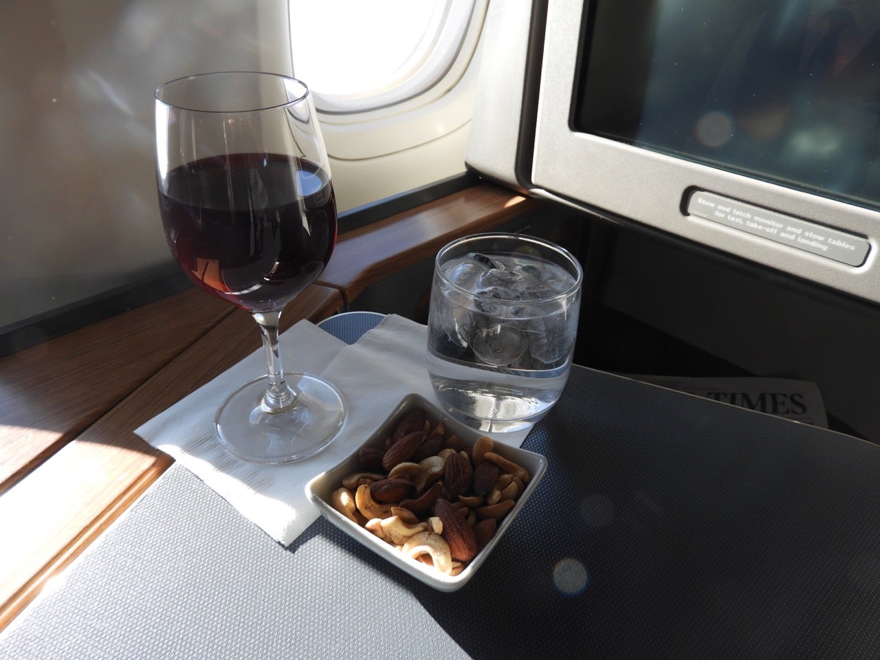 The presentation in Flagship First is more sophisticated than in business with full-size wine glasses, Champagne flutes, large plates and bowls and no tray. The quality of the china and cutlery is consistent in both cabins.