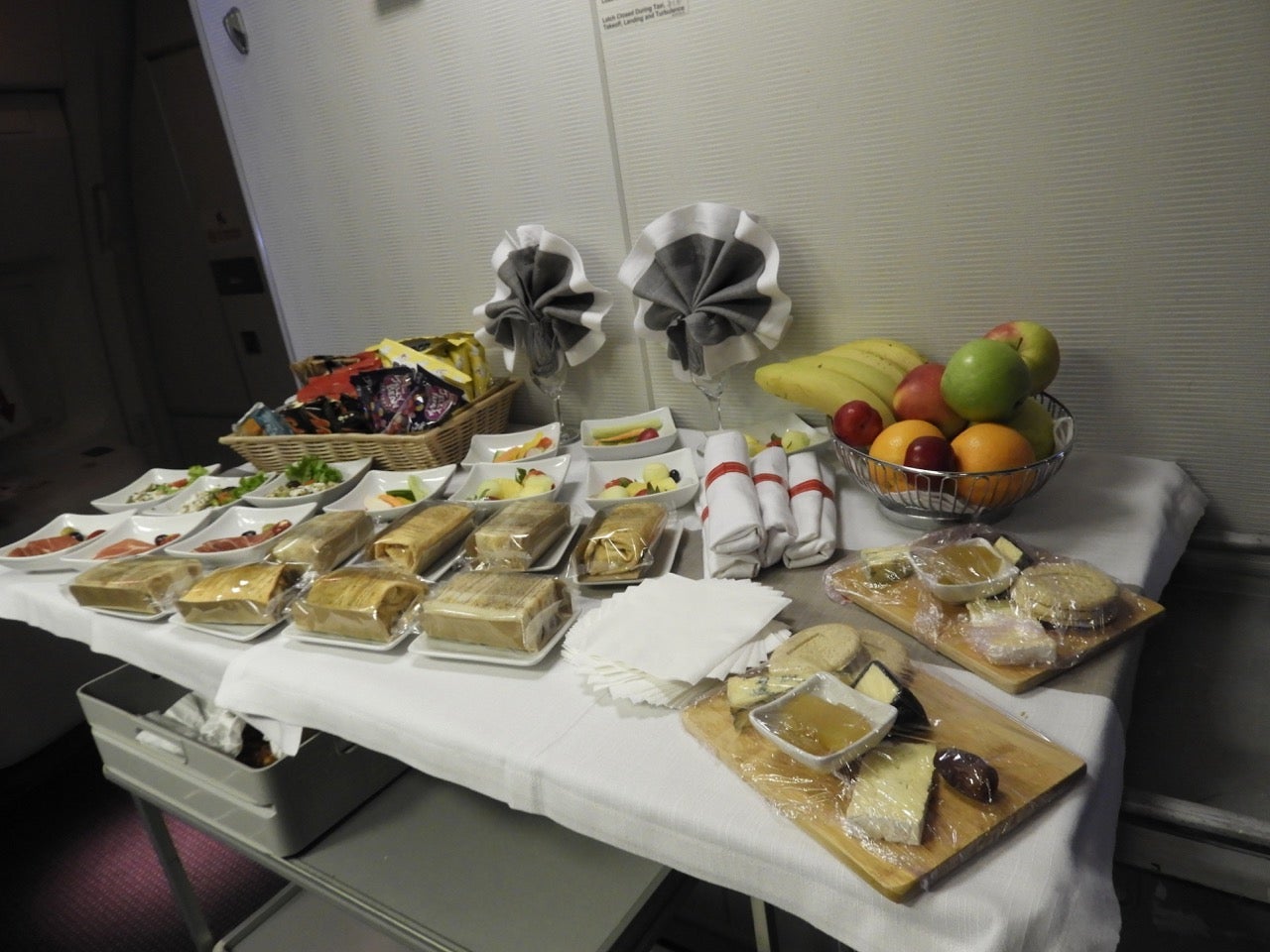 It offers an overwhelming choice of tapas, such as antipasto, crudité, fruit and sandwiches. Regional selections such as Bibim-guksu, a Korean spicy noodle dish, are offered on select flights. The snack table is well stocked with sweet and savory treats, particularly on daytime flights.