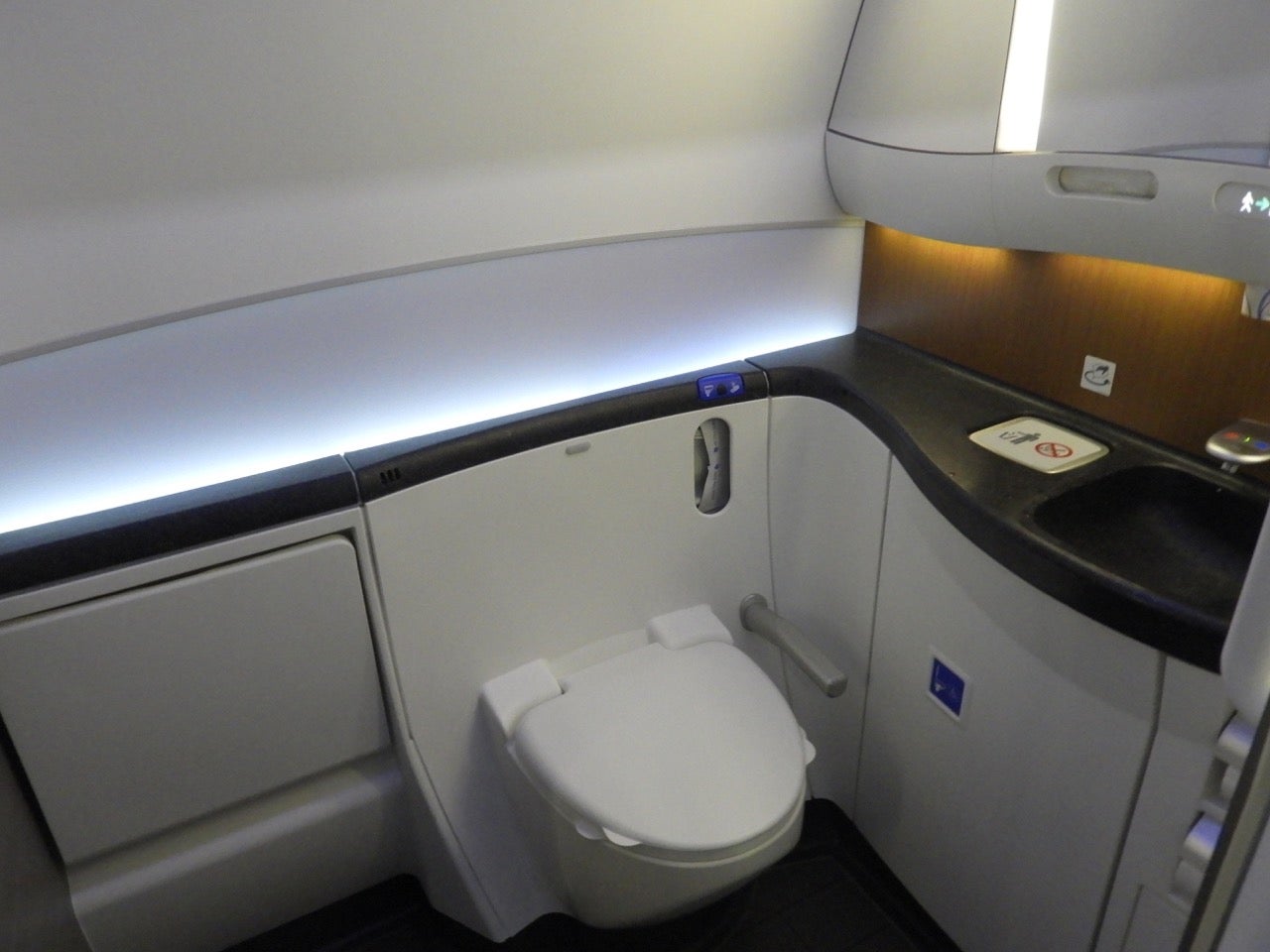 As for the lavatories, this varies, but generally for international aircraft, first has at minimum a ratio of one dedicated lav per 8 passengers. The two-three dedicated business lavatories produce a ratio of one per 19 passengers. AA's premium lavatories on its newer wide-bodies are a step up in terms of finishes, vessels, dimensions and hygiene products. Premium economy shares its unadorned lavatories with Main Cabin with a ratio of up to one per 50 passengers.