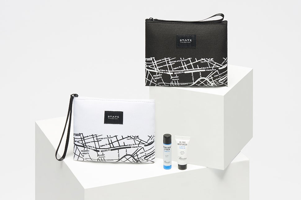 The amenity kits in premium economy are designed by State Bags and feature skincare products from Baxter of California.