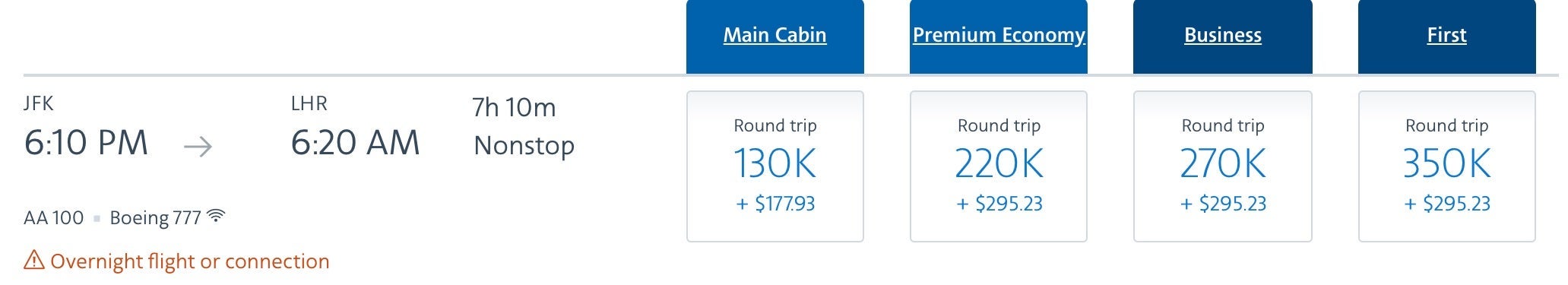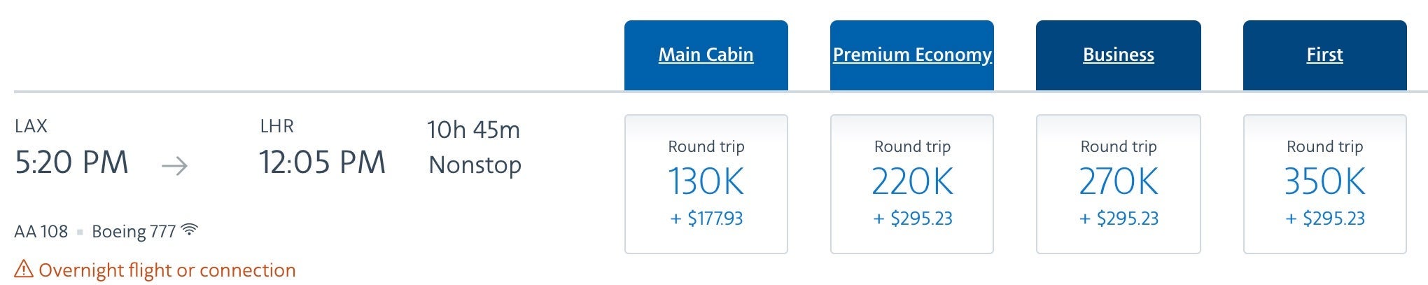 AAdvantage award travel on the same flights were unavailable at the lower MileSAAver awards redemptions, so we resorted to the higher redemption level AAnytime Awards. This has become a bigger trend as AA moves to a dynamic award-pricing model. Premium economy award tickets must be booked using a special desktop tool at AA.com.