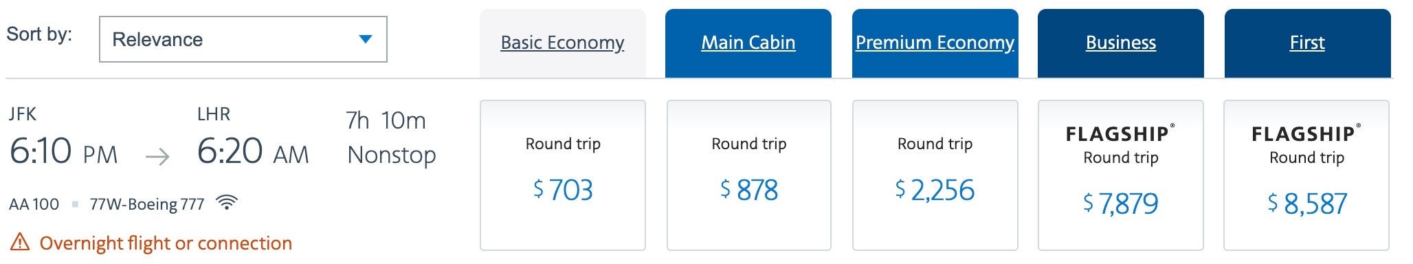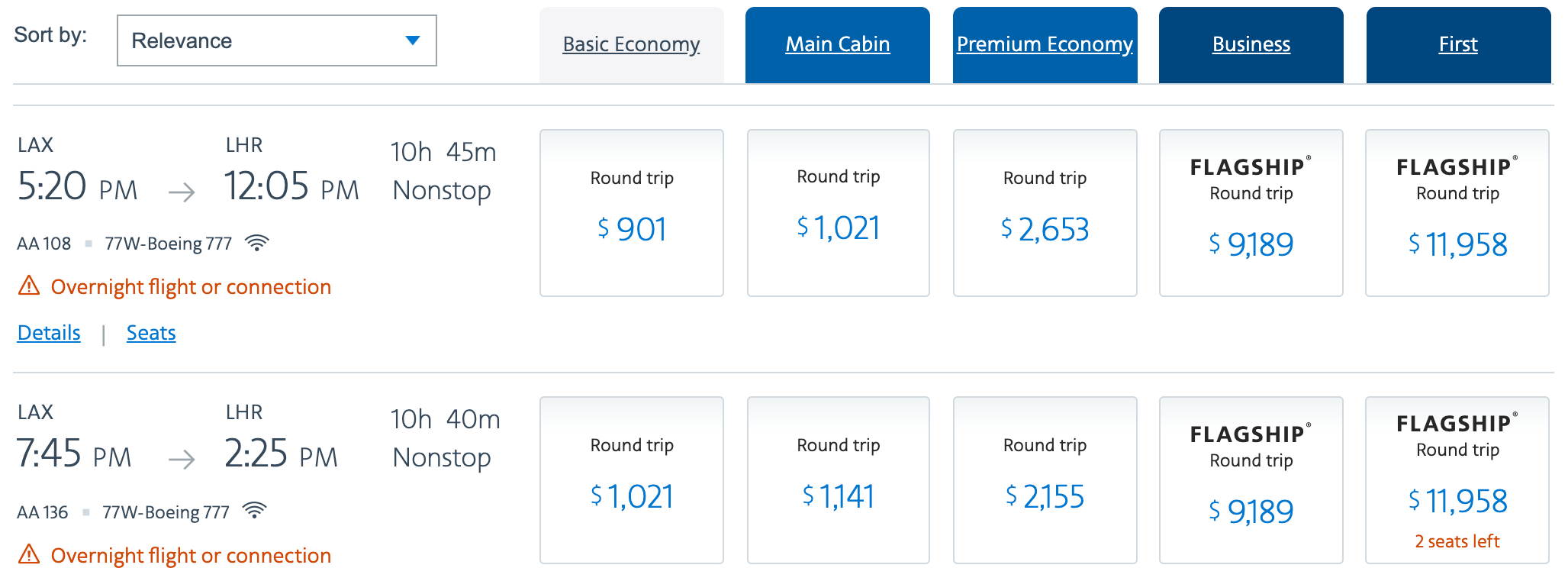 For comparison, we researched multiple round-trip flights operated by American in 777-300ERs configured with three premium cabins. Our tickets were 21-day advanced, restricted lowest fare tickets during the peak summer travel period. Premium Economy fares can command a premium over Main Cabin of anywhere from 35% to more than double that. Stepping up from premium economy to business costs three to four times more. Upgrading from business to first costs as little as $708 extra between New York and London to as high as $2,409 between Los Angeles and London.